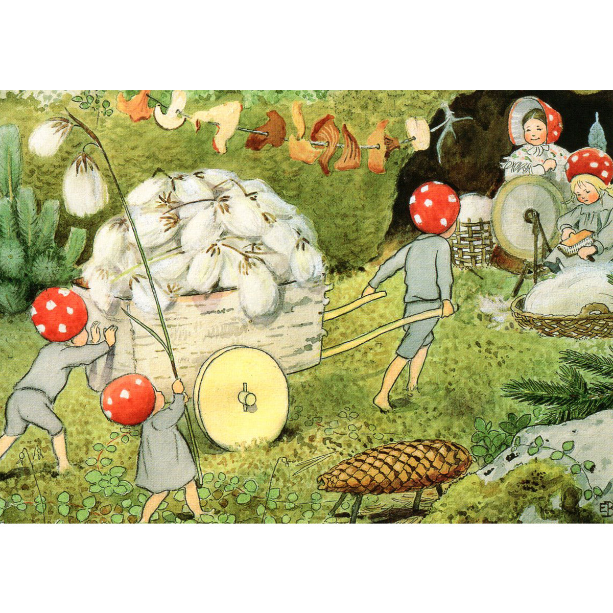 Elsa Beskow Postcard, Mushroom Children Harvesting Dandelions - 4-1/8" x 5-13/16"
