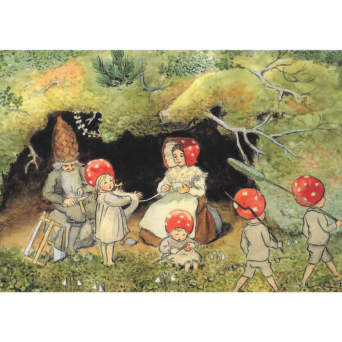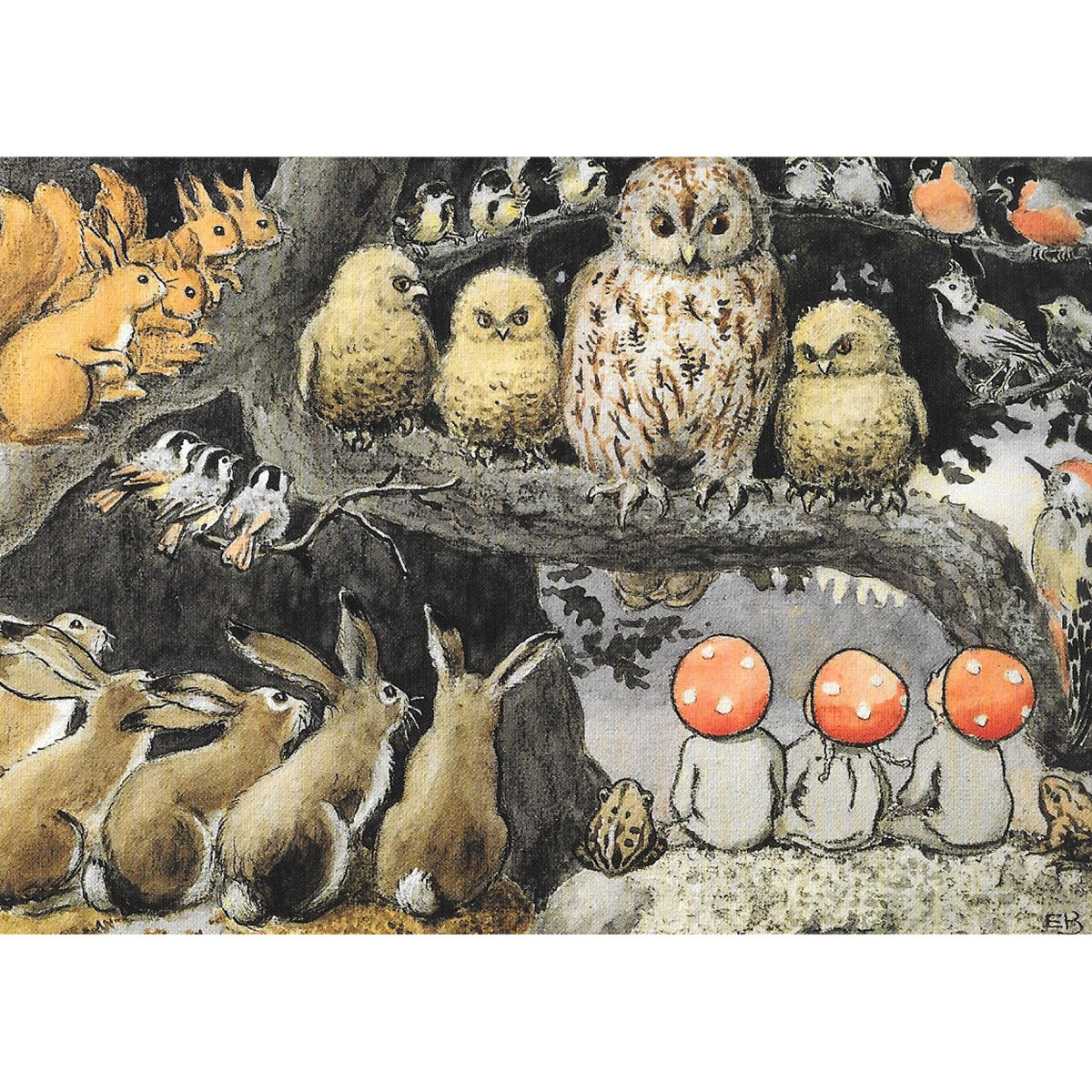 Elsa Beskow Postcard, Mushroom Family Visits Owl - 4-1/8" x 5-13/16"
