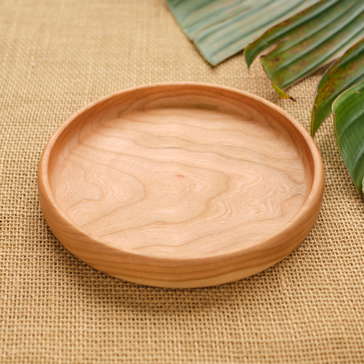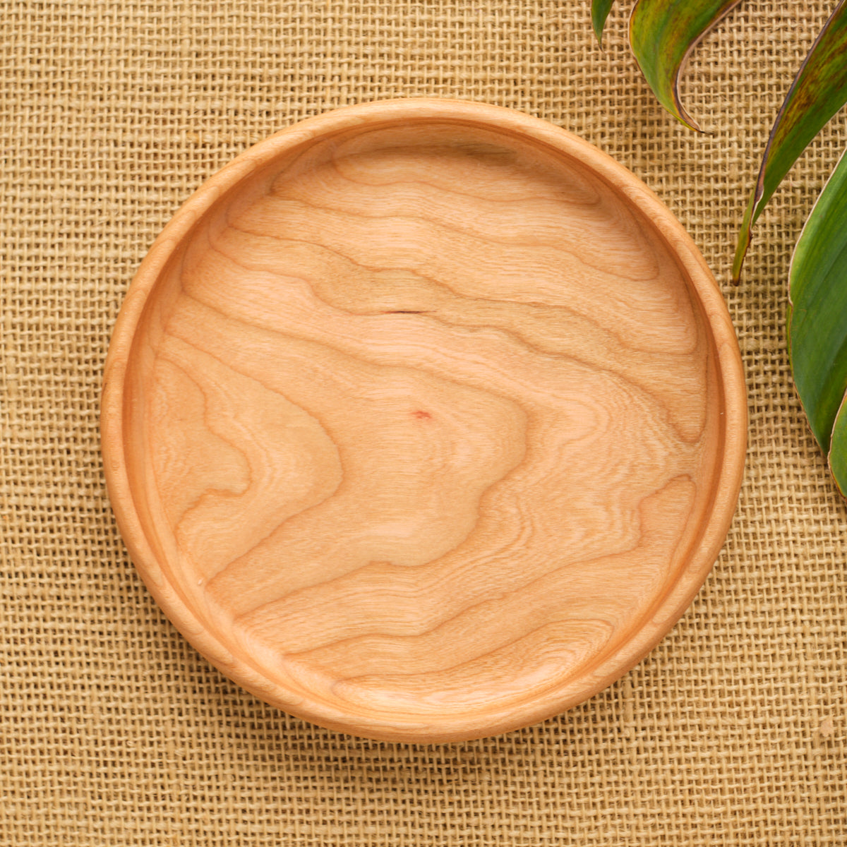 Solid wood plates for your dining pleasure! Match with our wooden bowls and wood utensils. These beautiful cherry plates are sized at 6 1/4" -- just right for young children, small servings, a bread or dessert. Cherry wood is a beautiful, living wood that darkens with light exposure, which will transform into a deep brown red over time.