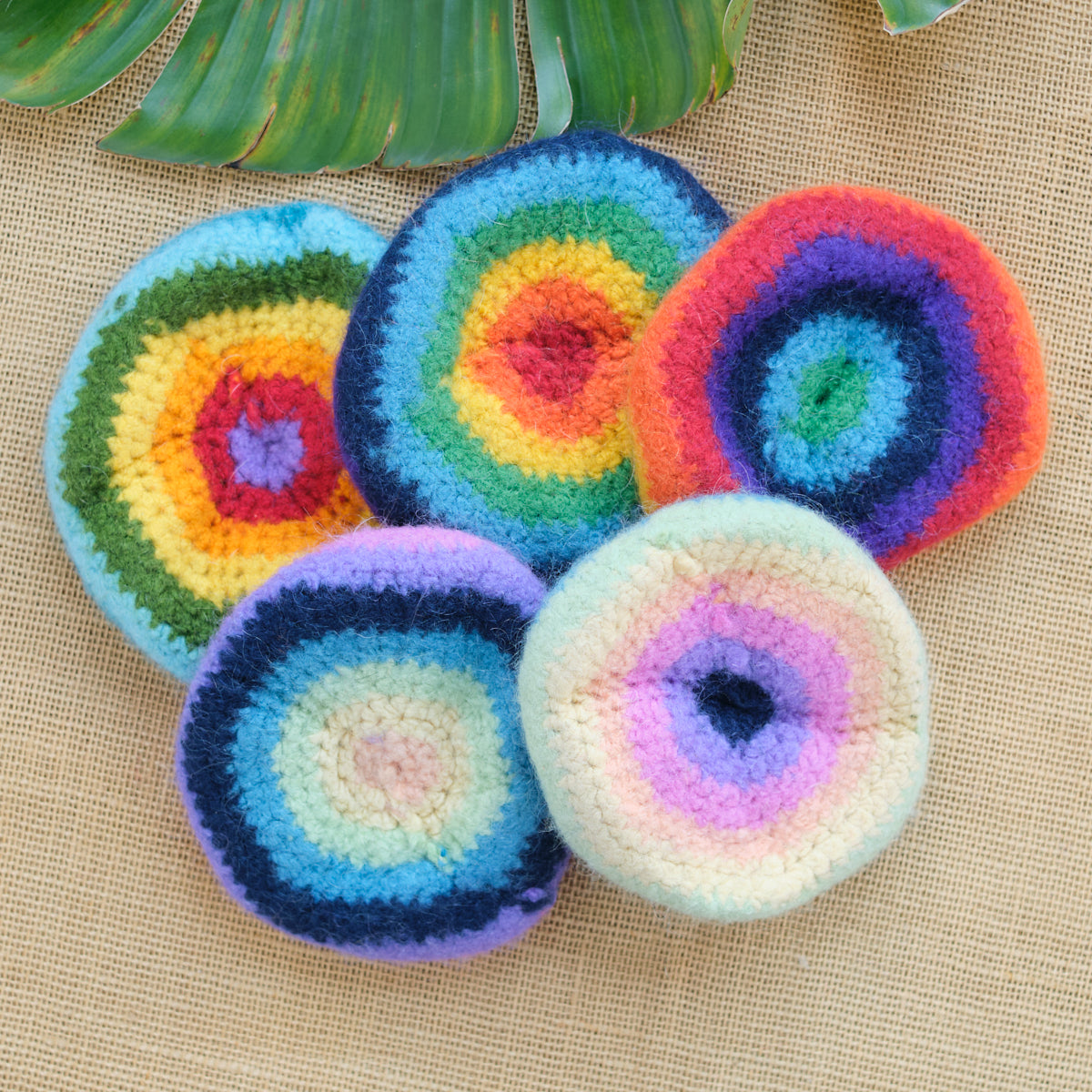 This is one 'frisbee' that won't cause you to shudder when your kids toss it through the house! Soft, 100% wool is crocheted and felted into a colorful flying disc! There are slight color variations with each pattern, so please allow for color variation.