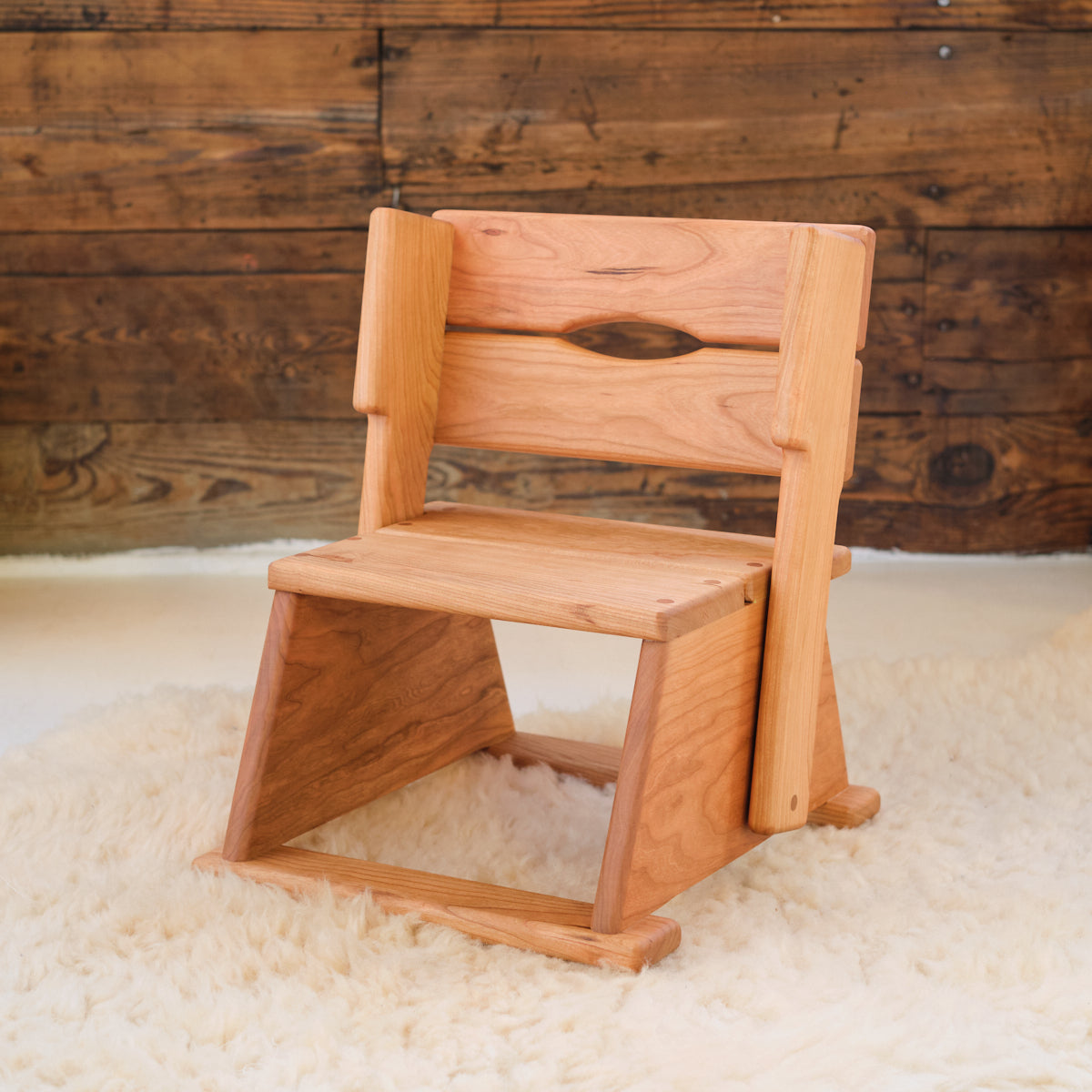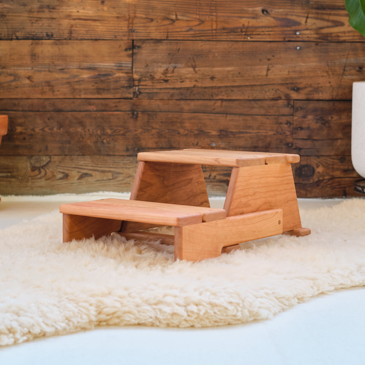 The Folding Step Stool by Camden Rose has two step heights when unfolded: 3 3/4" and then 7 1/2". Made from cherry hardwood, it easily converts to a toddler-sized chair that is a perfect fit for our Play Table! (with short table legs). Finished with our own Three BEEautiful Bees All-Natural Beeswax Polish.