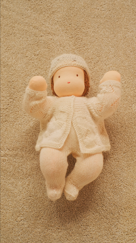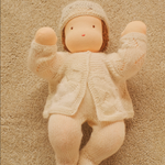 The 15" Waldorf Baby Doll has a cap of curly wool hair, with moveable jointed arms and legs. Clothed in a natural/white cotton knit bonnet and gown with lace trim. Firmly stuffed with pure wool inside, the baby doll's body becomes warm when held, imparting warmth to your child as they love and care for their doll.