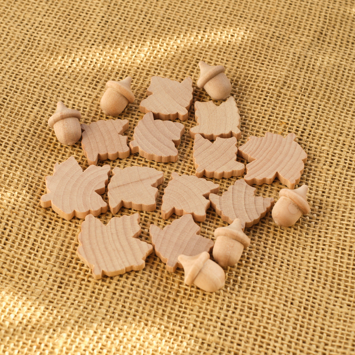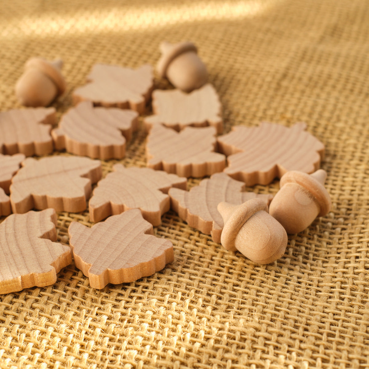 Versatile wooden acorns and leaves are a favorite in the play kitchen, for crafting, or for decorating a seasonal nature table. They may also be used as a prop when children begin learning to count and group items.