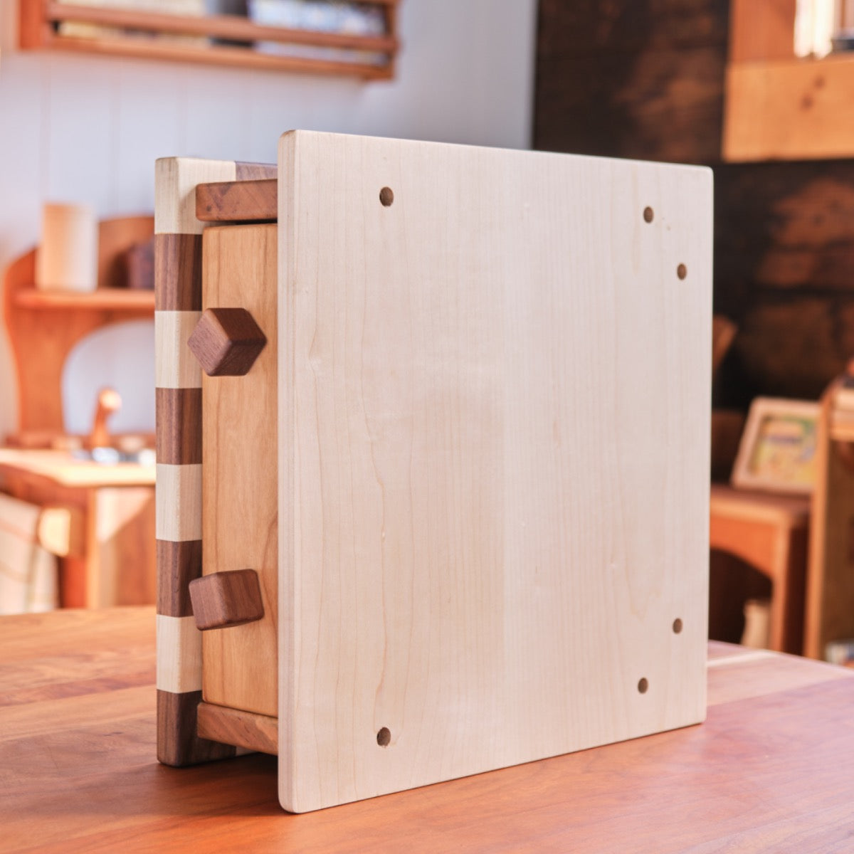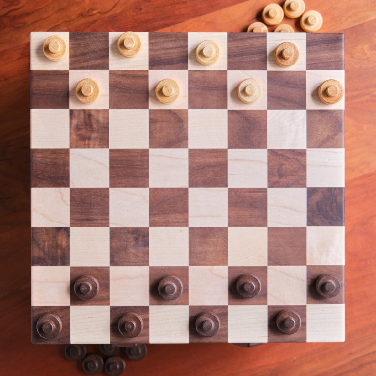 This large walnut and maple storage chess board with drawer is ideal to store our stacking wood checkers and chess pieces. The knobs on the drawer you twist in yourself. This chess/checker combination complements all interiors.