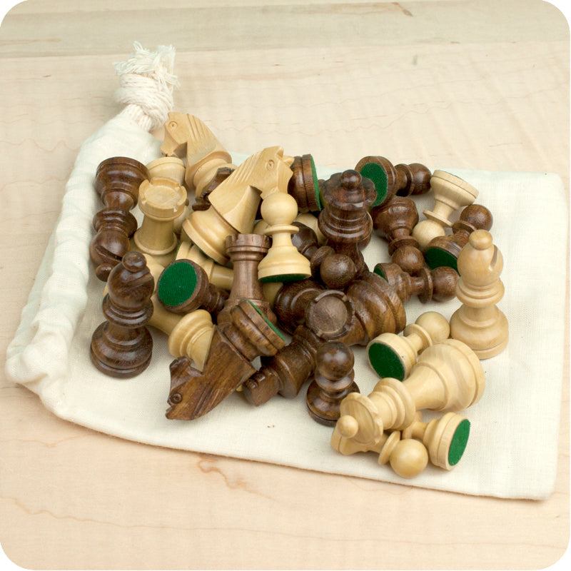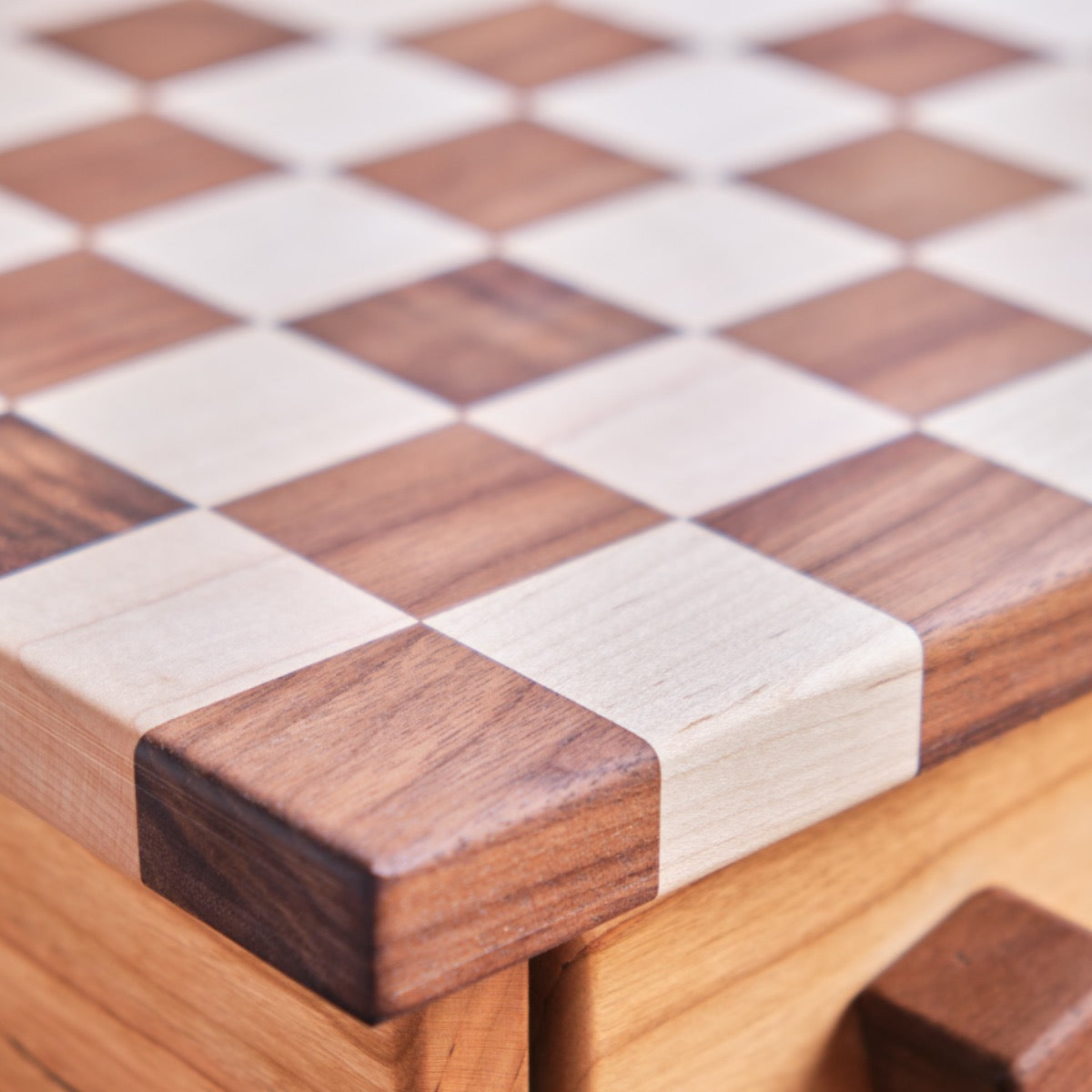 Chess or checker games often span for days. You won't mind leaving this chess / checker board with storage drawer on display. Set includes wooden chess pieces (about 3" high king) and unique stacking checkers. Contrasting light maple and dark walnut game board mounted on a classically designed cherry drawer with a beveled maple base. The knobs are unique threaded bolts that you can turn/adjust yourself.