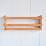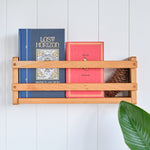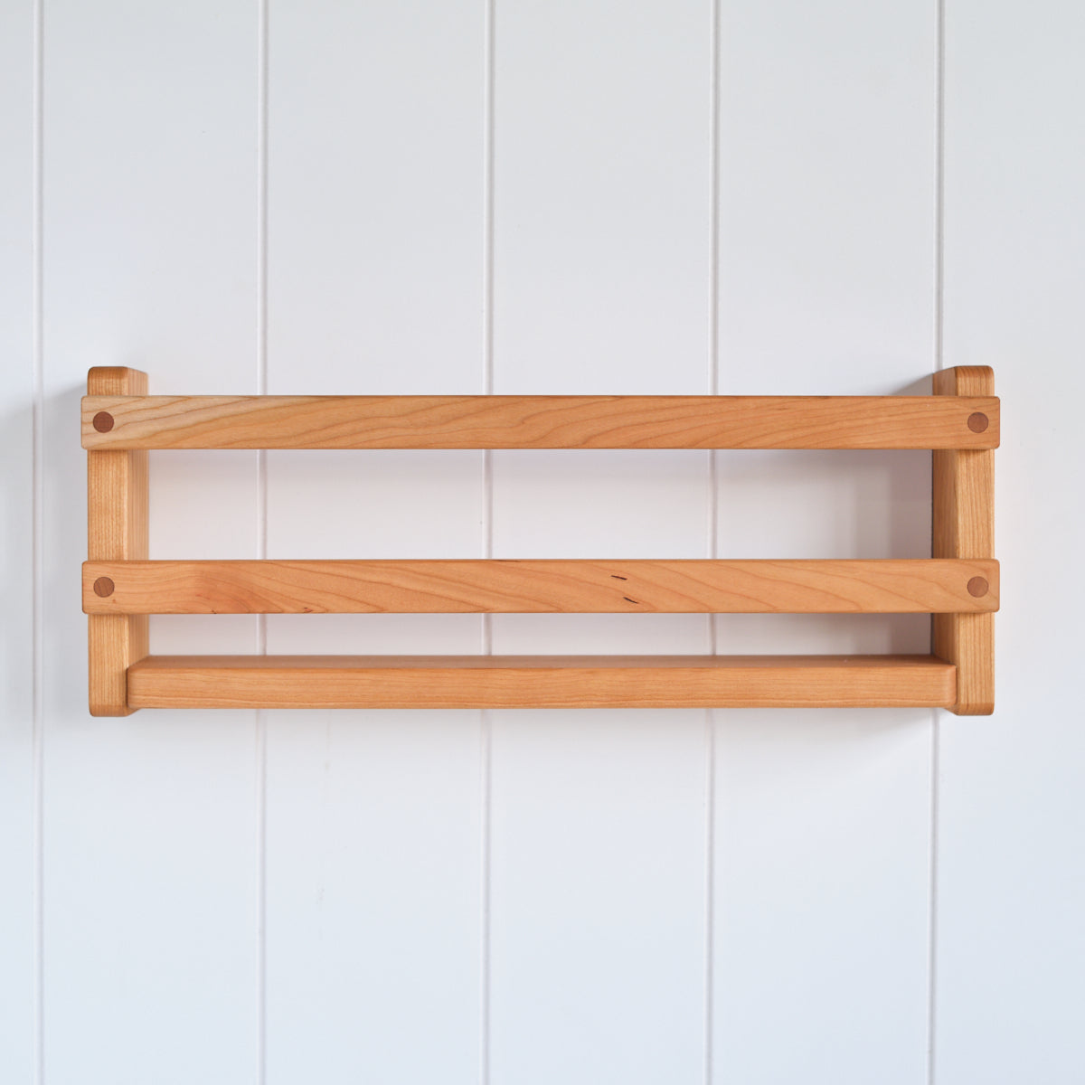 Simple design with loads of functionality. Display books, artwork, etc. Sized with keyholes on the back side panels at 16" for easy stud hanging (drywall may require anchors). Cherry wood with our All Natural Beeswax Polish.