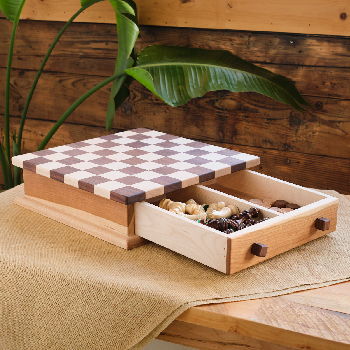 This large walnut and maple storage chess board with drawer is ideal to store our stacking wood checkers and chess pieces. The knobs on the drawer you twist in yourself. This chess/checker combination complements all interiors.
