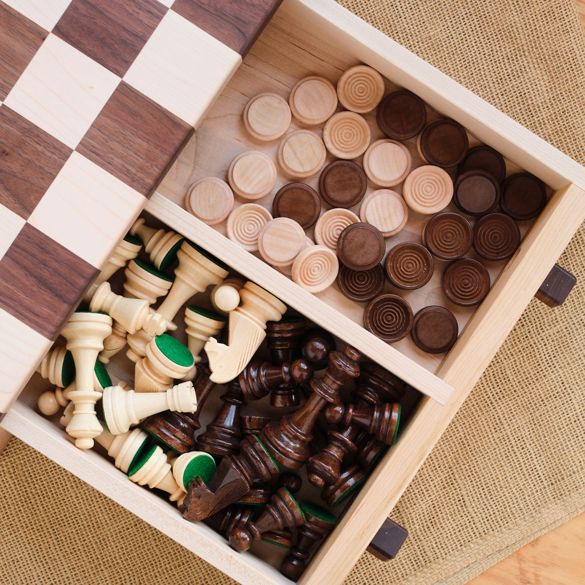 Chess or checker games often span for days. You won't mind leaving this chess/checker board with storage drawer on display. Set includes wooden chess pieces (about 3.75" high king) and unique stacking checkers. Contrasting light maple and dark walnut game board mounted on a classically designed cherry drawer with a beveled maple base. The knobs are unique threaded bolts that you can turn/adjust yourself.