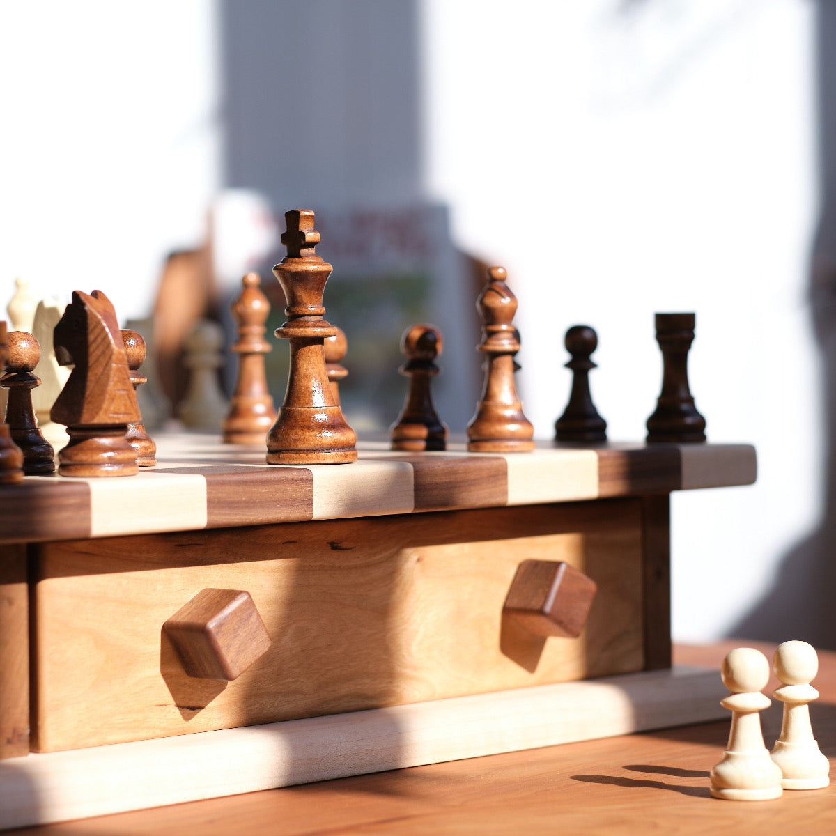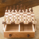 Chess or checker games often span for days. You won't mind leaving this chess/checker board with storage drawer on display. Set includes wooden chess pieces (about 3.75" high king) and unique stacking checkers. Contrasting light maple and dark walnut game board mounted on a classically designed cherry drawer with a beveled maple base. The knobs are unique threaded bolts that you can turn/adjust yourself.