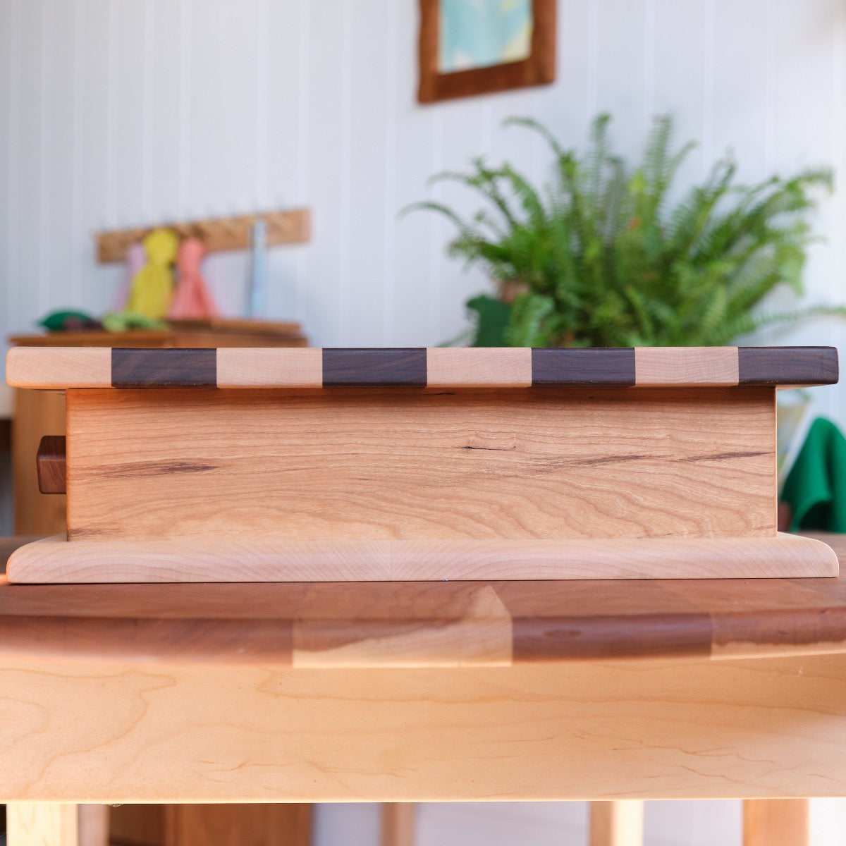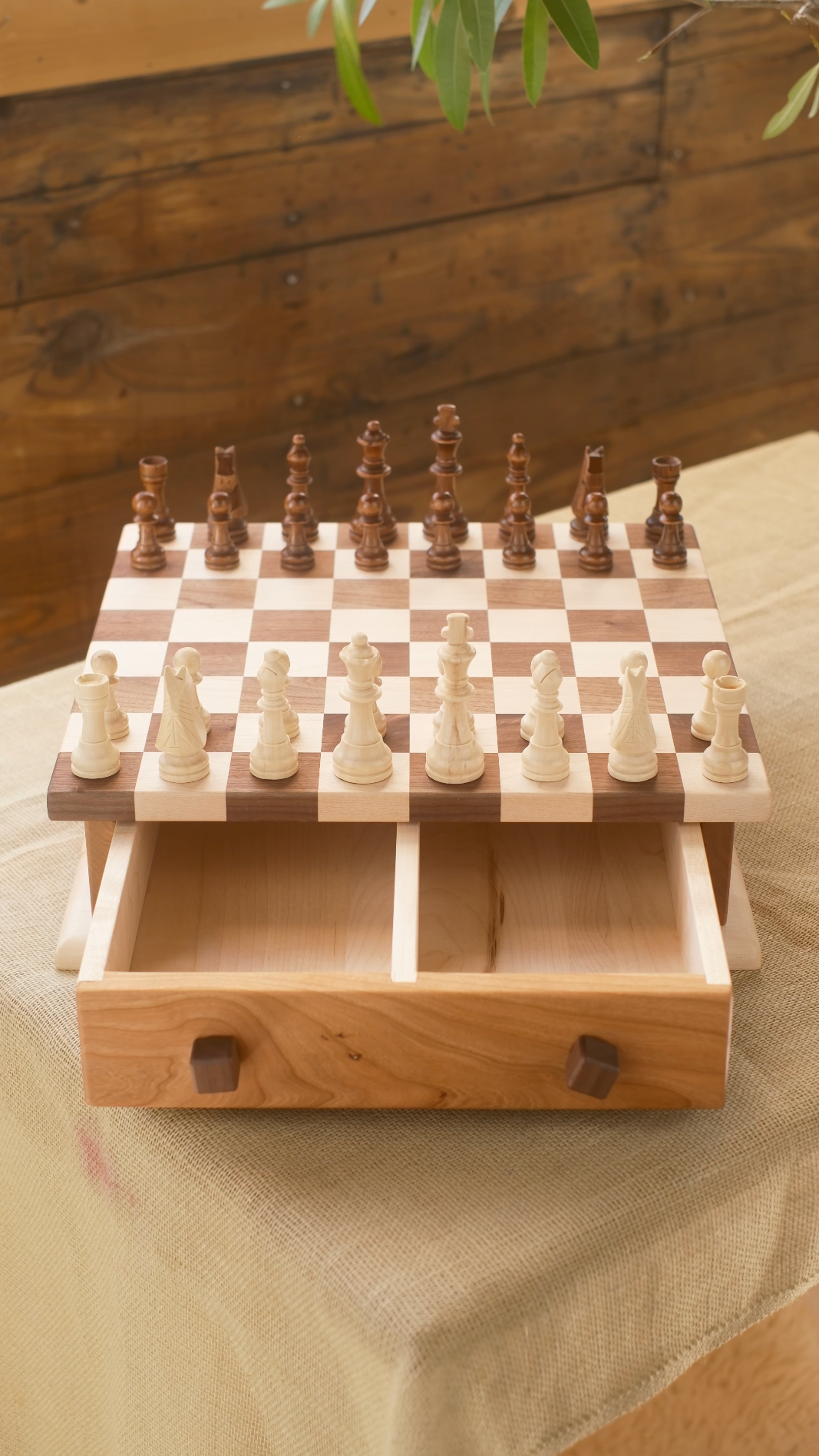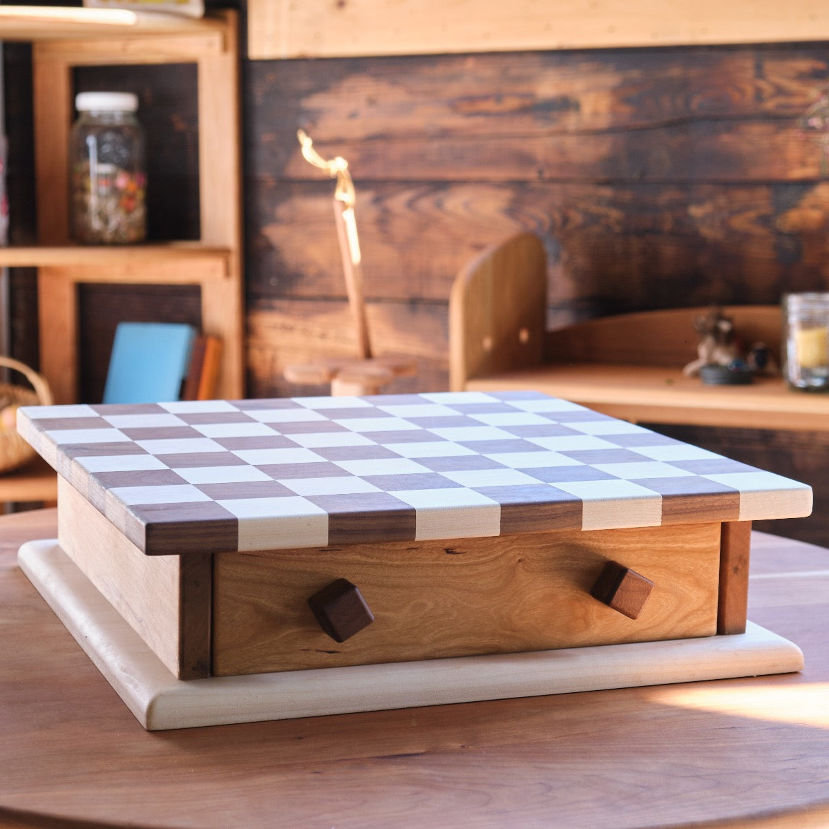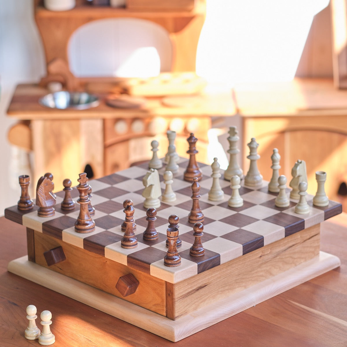 This large walnut and maple storage chess board with drawer is ideal to store our stacking wood checkers and chess pieces. The knobs on the drawer you twist in yourself. This chess/checker combination complements all interiors.