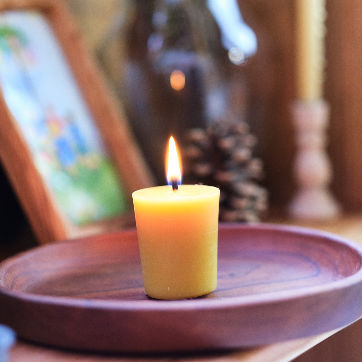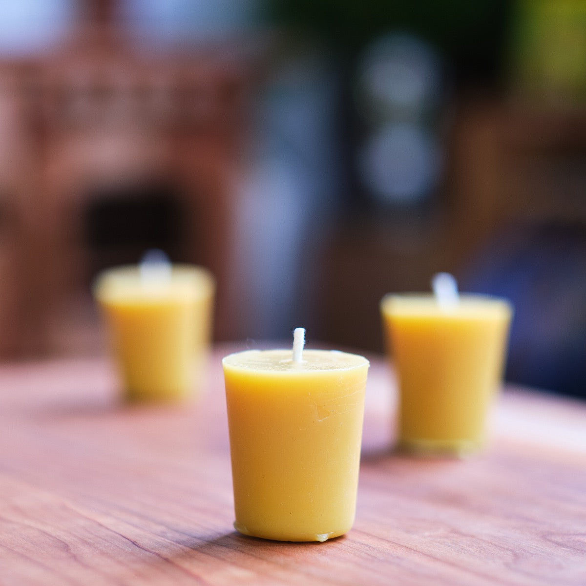 This votive candle is a nice size, 2" x 1 3/4, for longer burn time and provide a soothing natural light perfect for creating ambiance. Made from pure natural beeswax (from and in the USA), these candles are beautiful and delightfully fragrant. Place in a glass jar with a little water in the bottom for a great light source with less clean up! A great way to add non-toxic natural light.