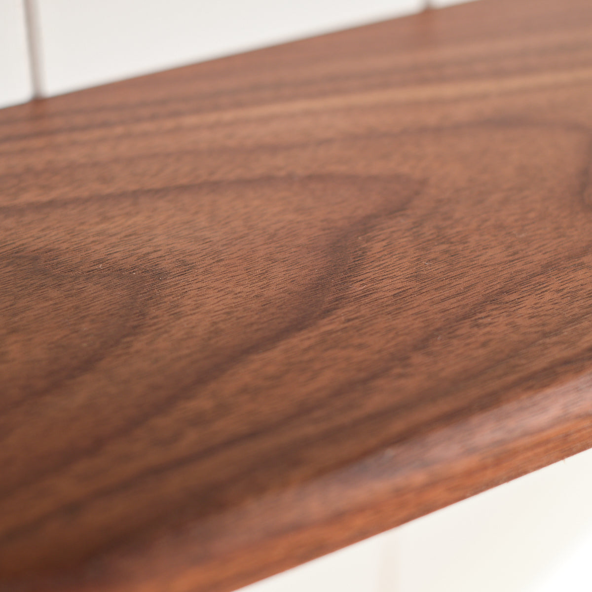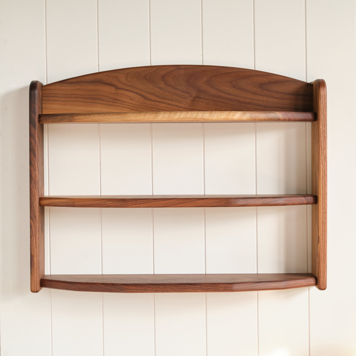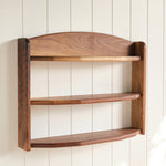 Our three-tiered wall shelf looks great in any room and matches our two-tiered version. Walnut hardwood adds a touch of class. Sculpted shelves add a soft feel. Very versatile, natural, functional décor.