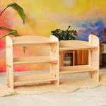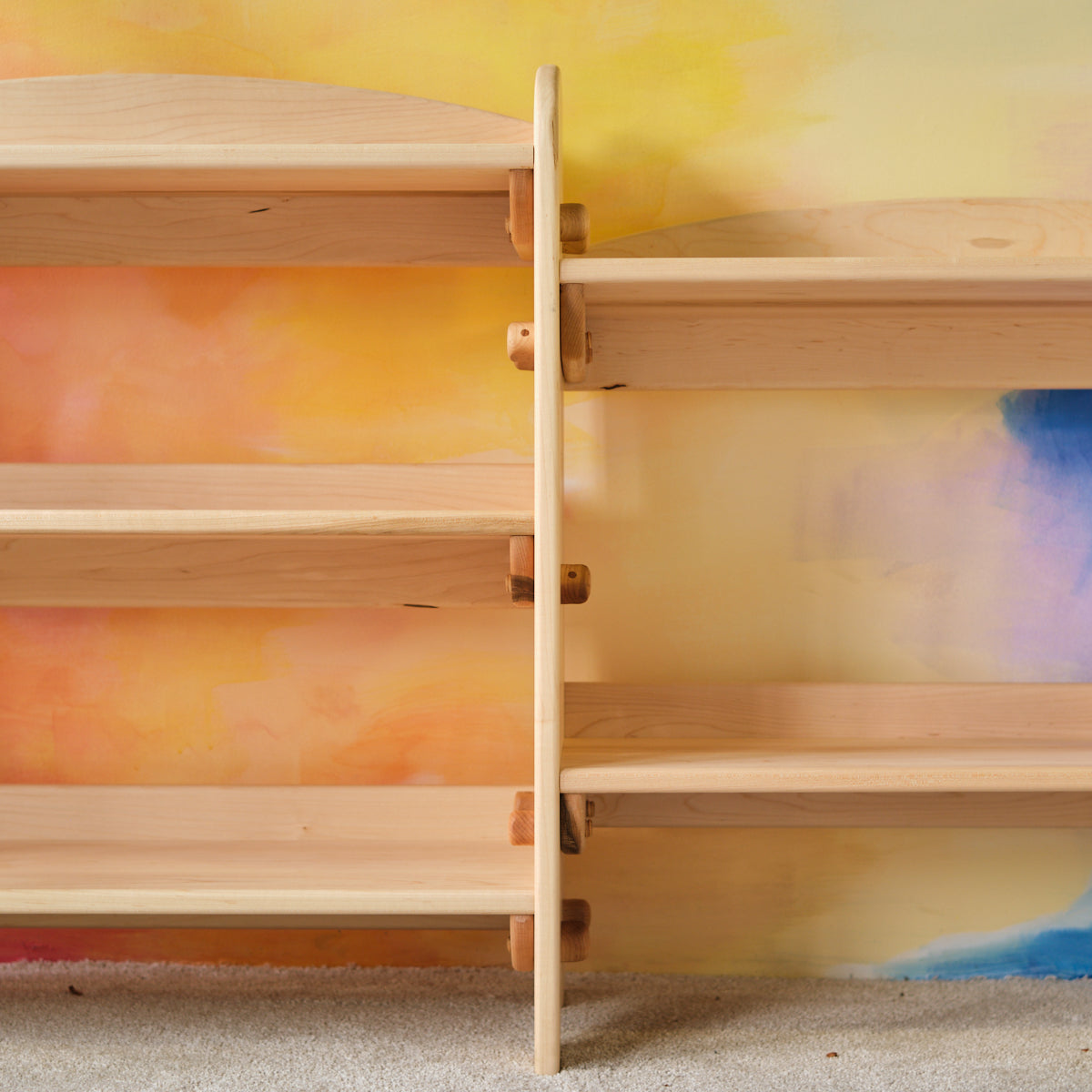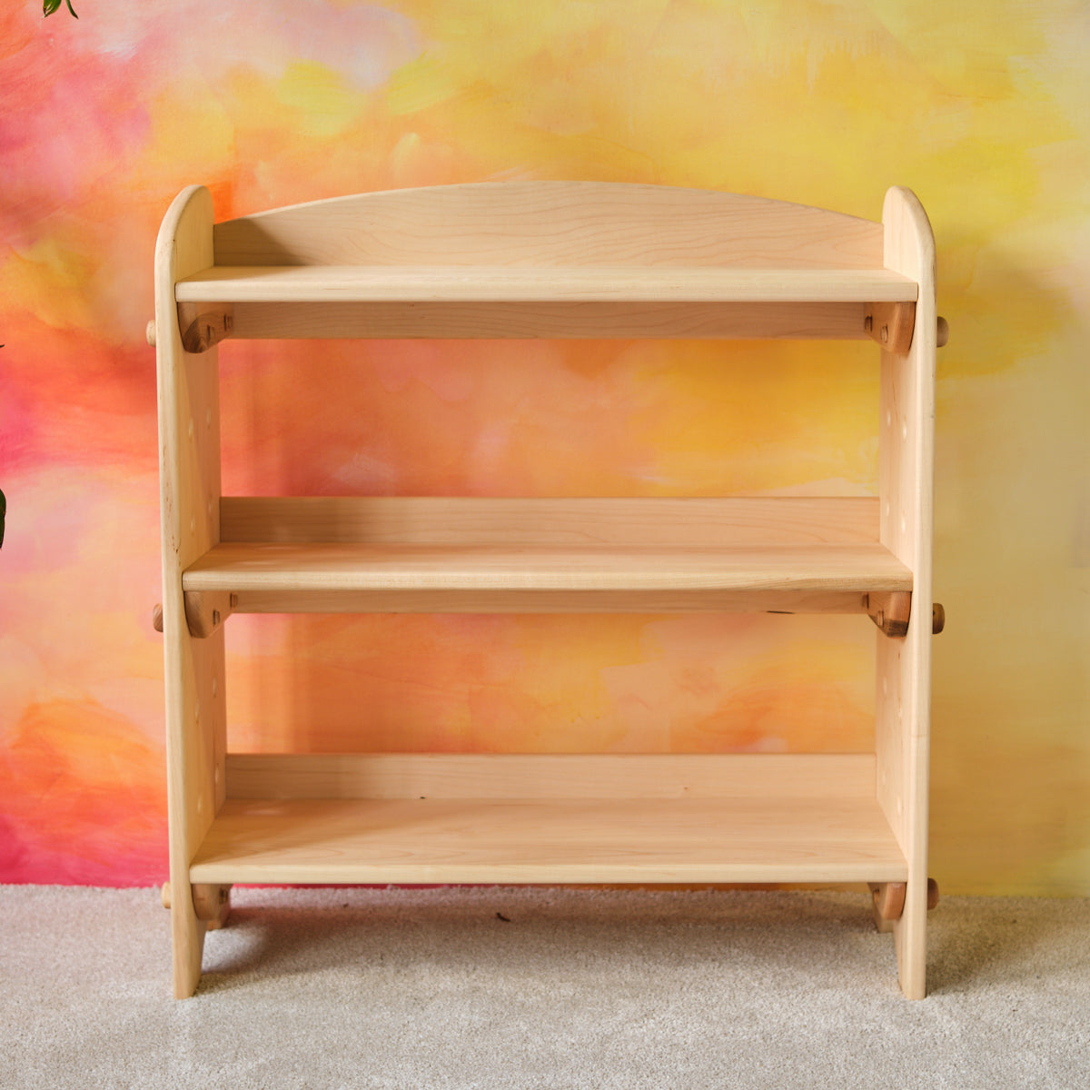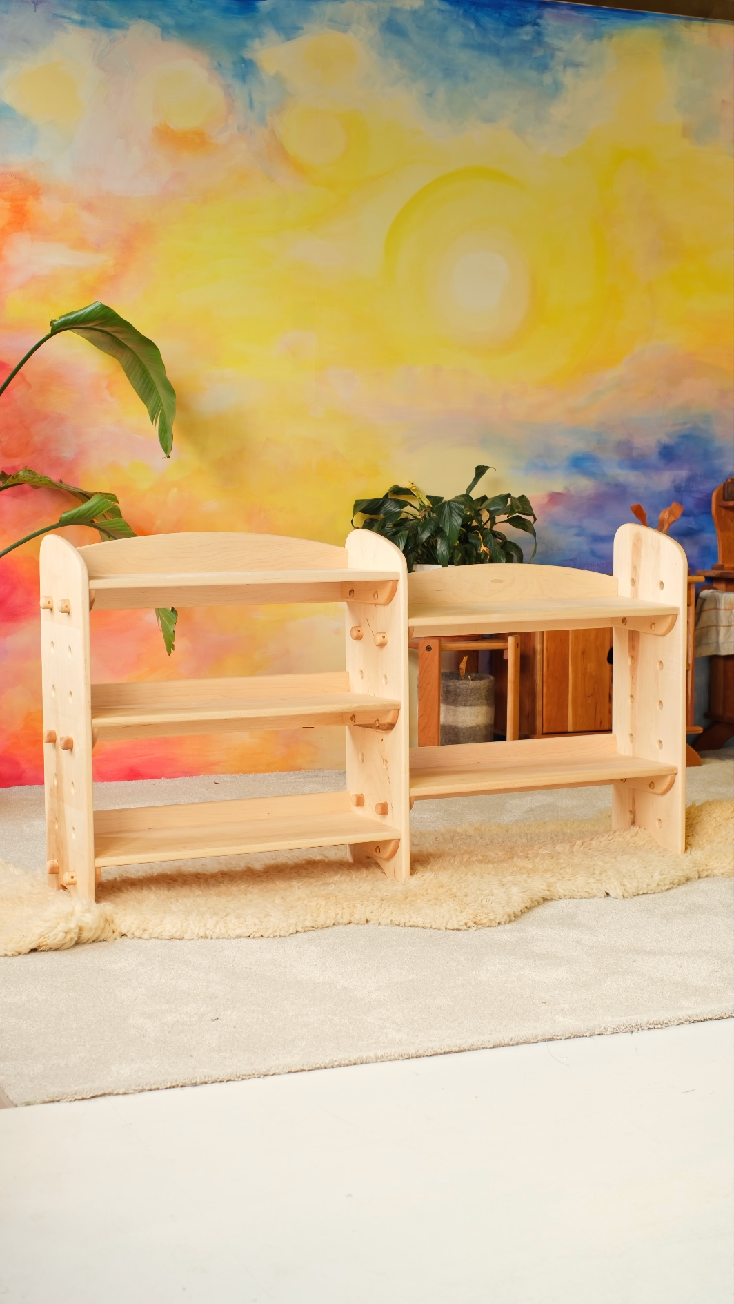 The 3-shelf base unit comes with two (2) sides, three (3) shelves [one top shelf, one interior middle, and one interior bottom], and twelve (12) bolts. There are even (7) sets of holes on each side panel that you can choose to mount shelves on. Made from solid Maple wood. Finished with our Three BEEautiful All-Natural Beeswax Polish.
