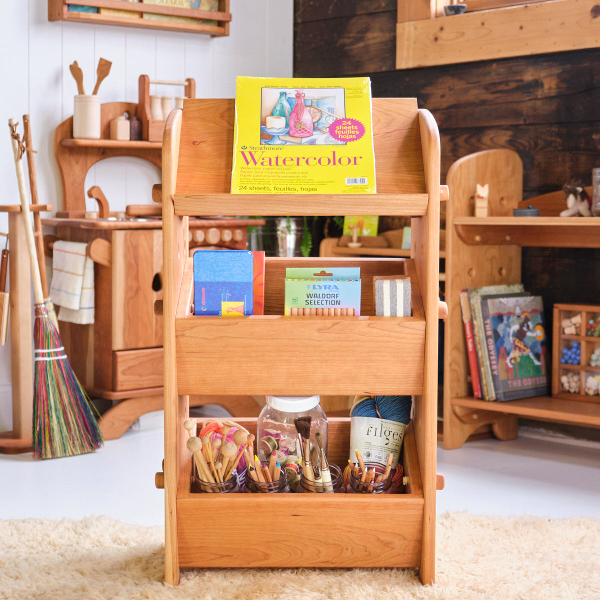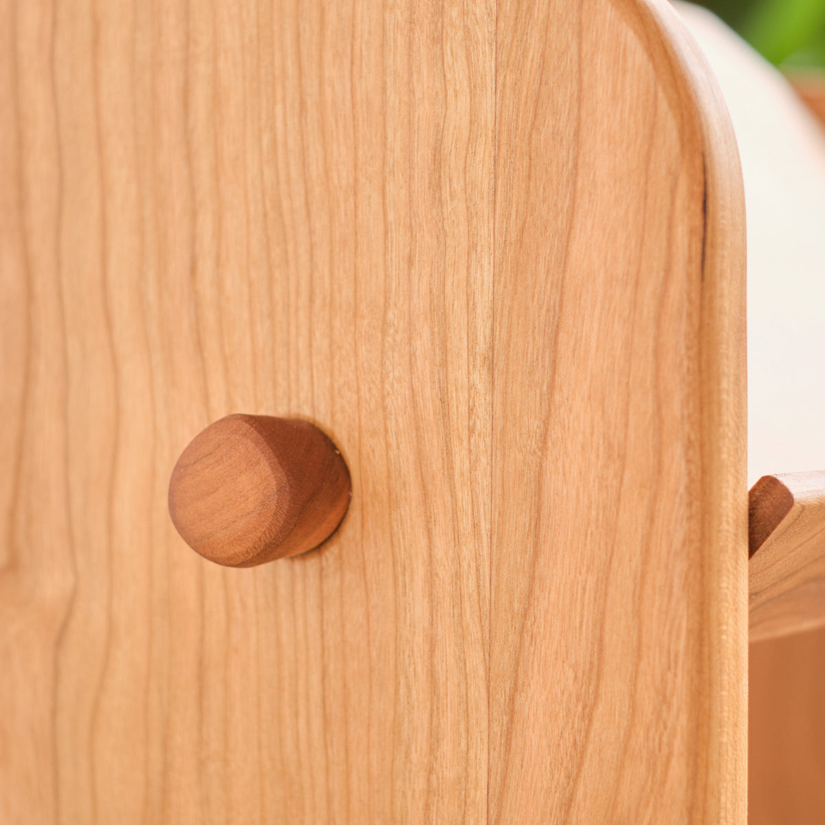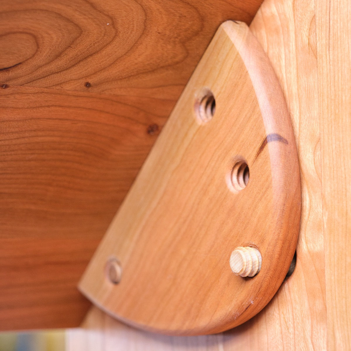 To compliment our 32" Adjustable Bookshelf, we created storage compartment that has many uses; produce station for kitchen, toy storage, book or art caddy. The holes on the side panels offer flexibility for you to control how high or low you want the spacing. This is fastened together using custom made wooden bolts!