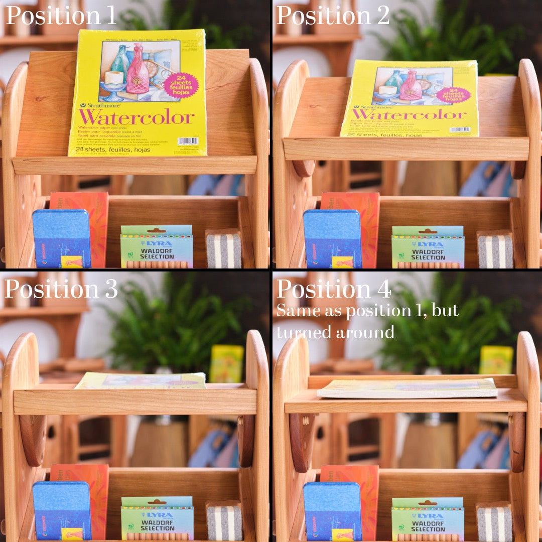This multi-use Adjustable Storage/Art Display/Music Stand is ideal for any playroom or room that needs some extra storage! The holes on the side panels offer flexibility for you to control how high or low you want the spacing.