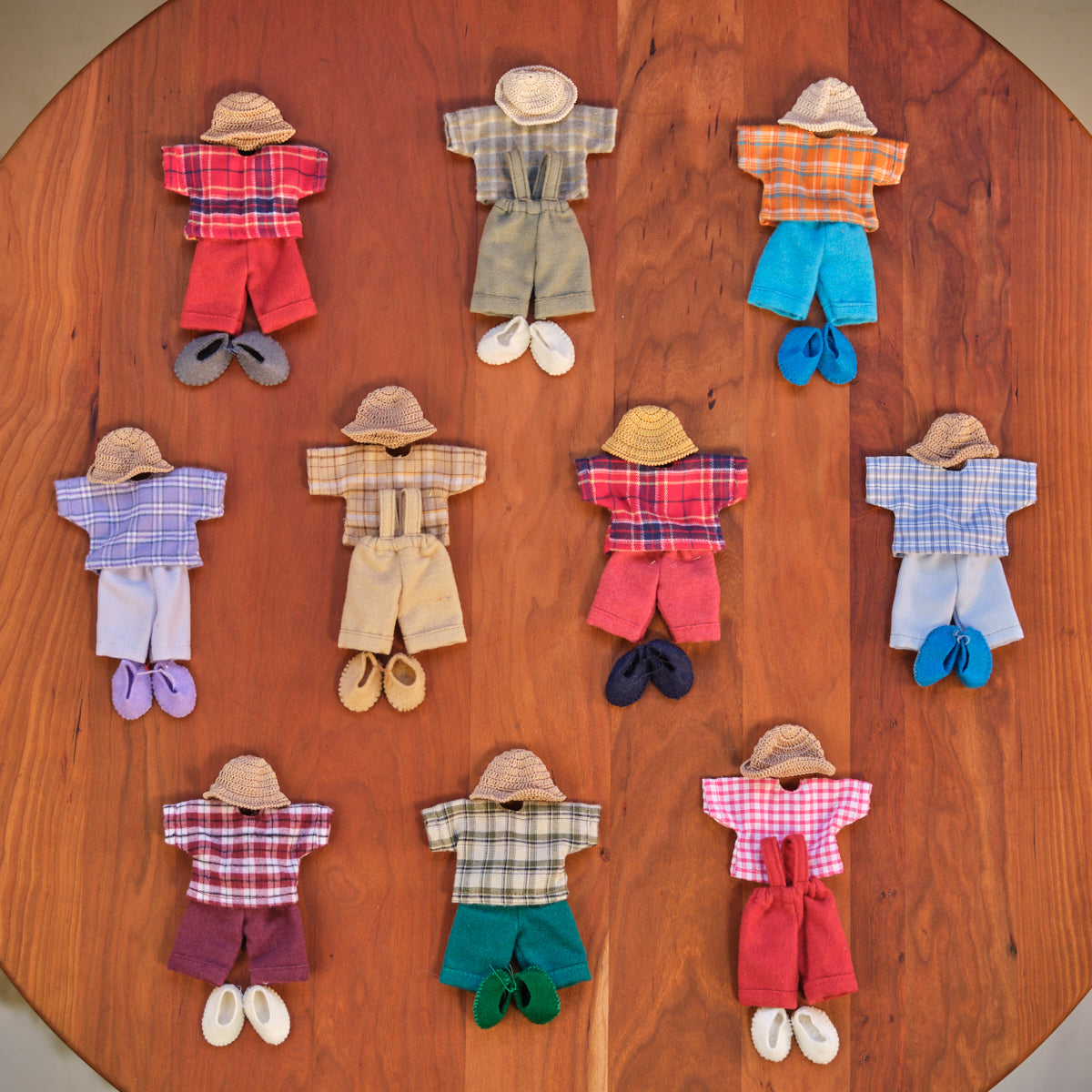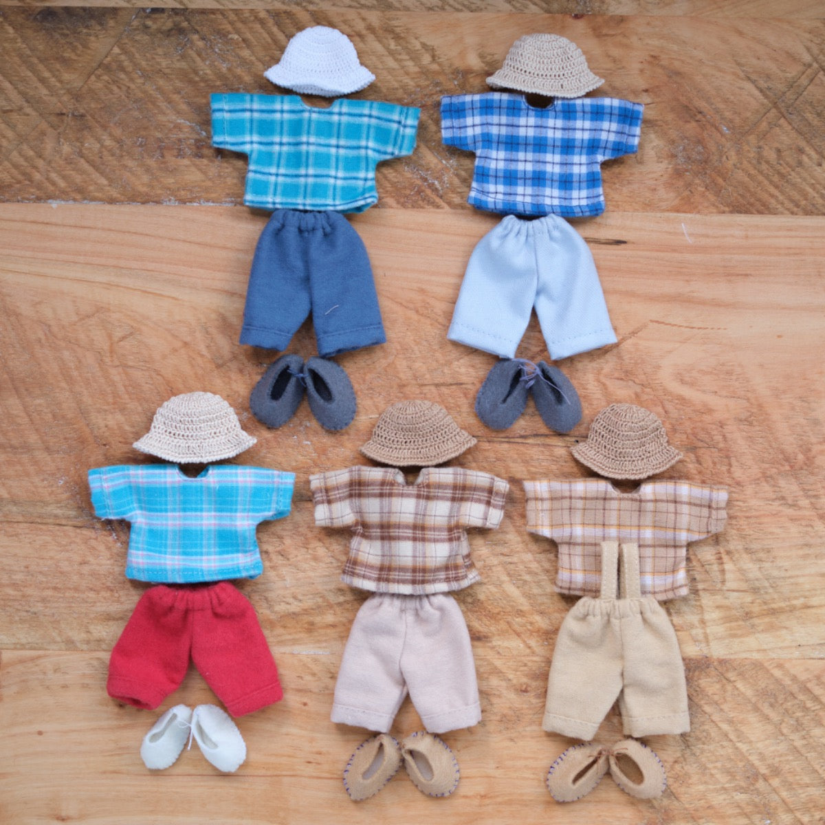 Unique and elegant clothing for your 5.5" dollhouse doll! This is a 3 piece set that includes a hat, pants or overalls and a shirt.