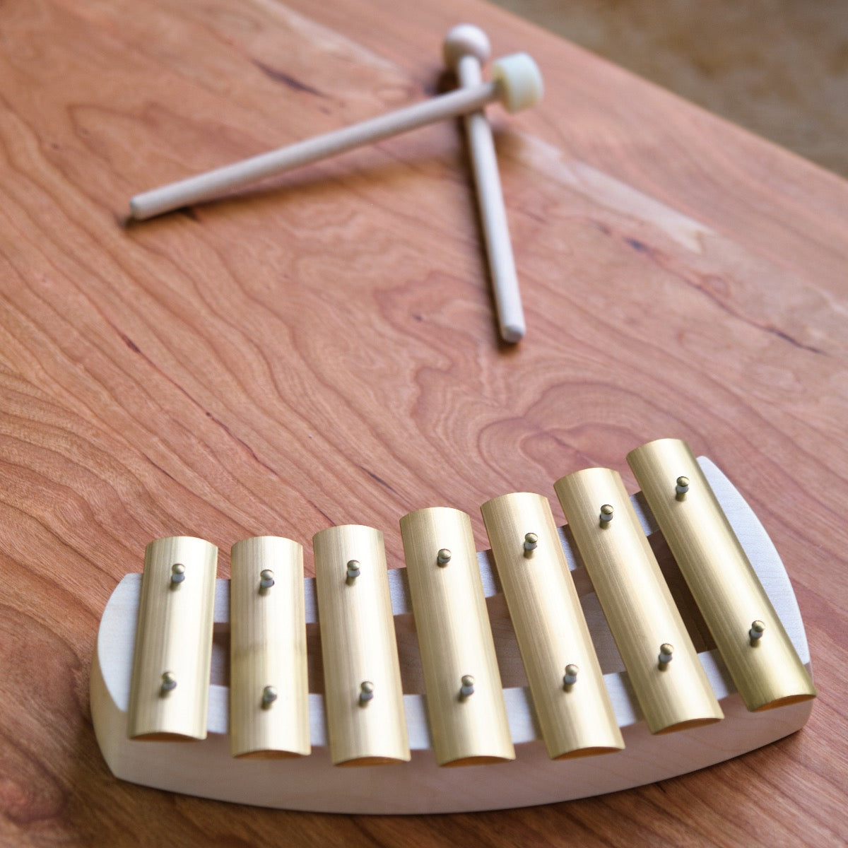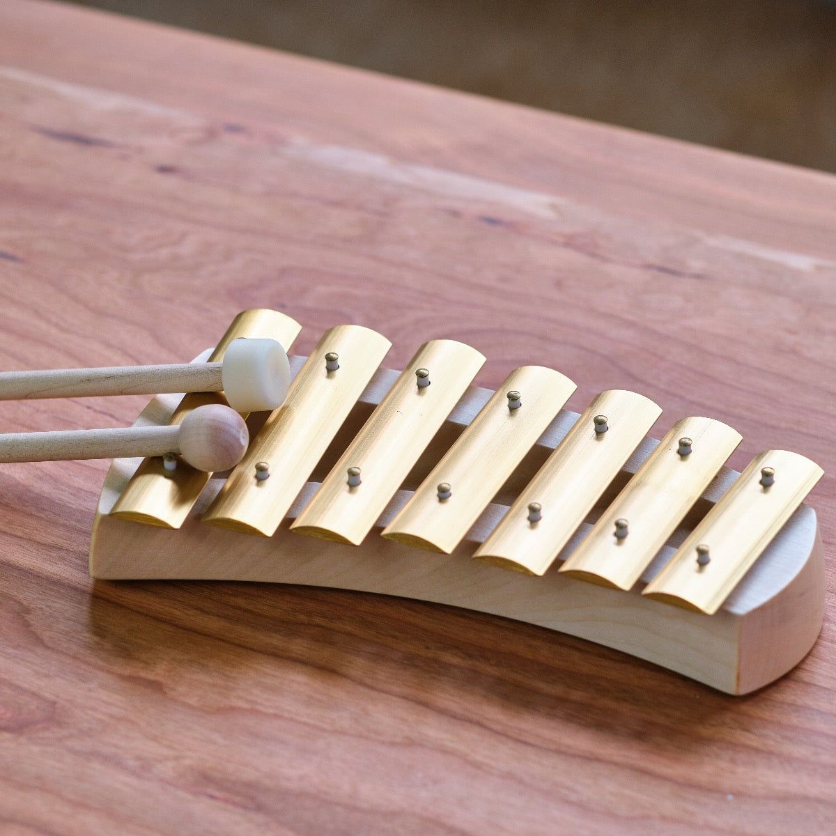 - Materials: Brass alloy tone bars, maple wood, rubber (mallets)