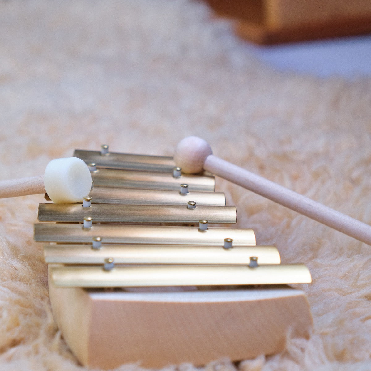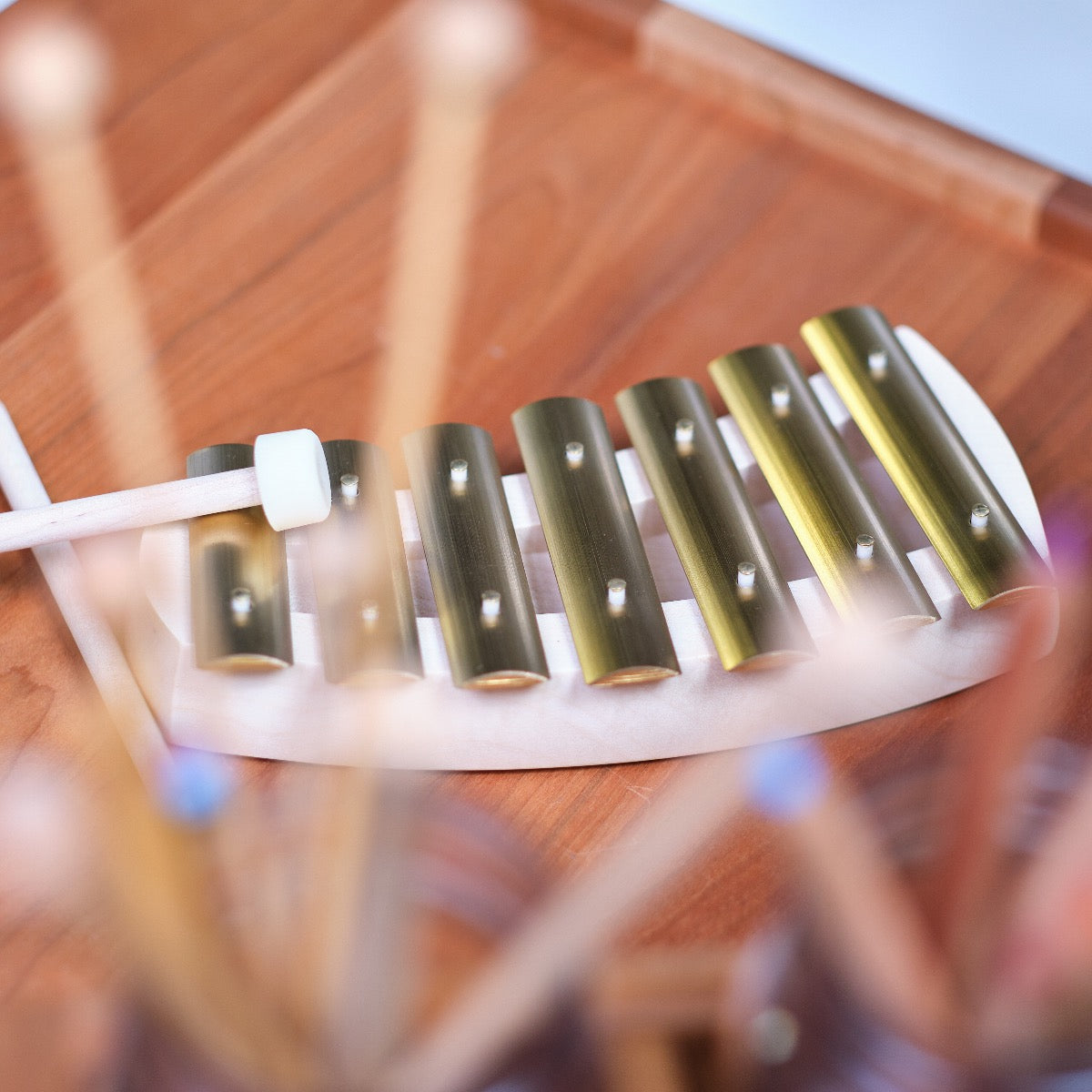 The Auris Glockenspiel is very finely tuned with a clear, pure overtone. With a crystal clear, spherical tone it creates a lovely sound experience. A percussion instrument, the glockenspiel is played with wood or plastic mallets. Finished with beeswax to protect the natural gloss of the brass. The brass surface of the keys will obtain a patina and look better the more it is used. Also available is this simpler, Auris 3 tone Glockenspiel.