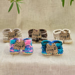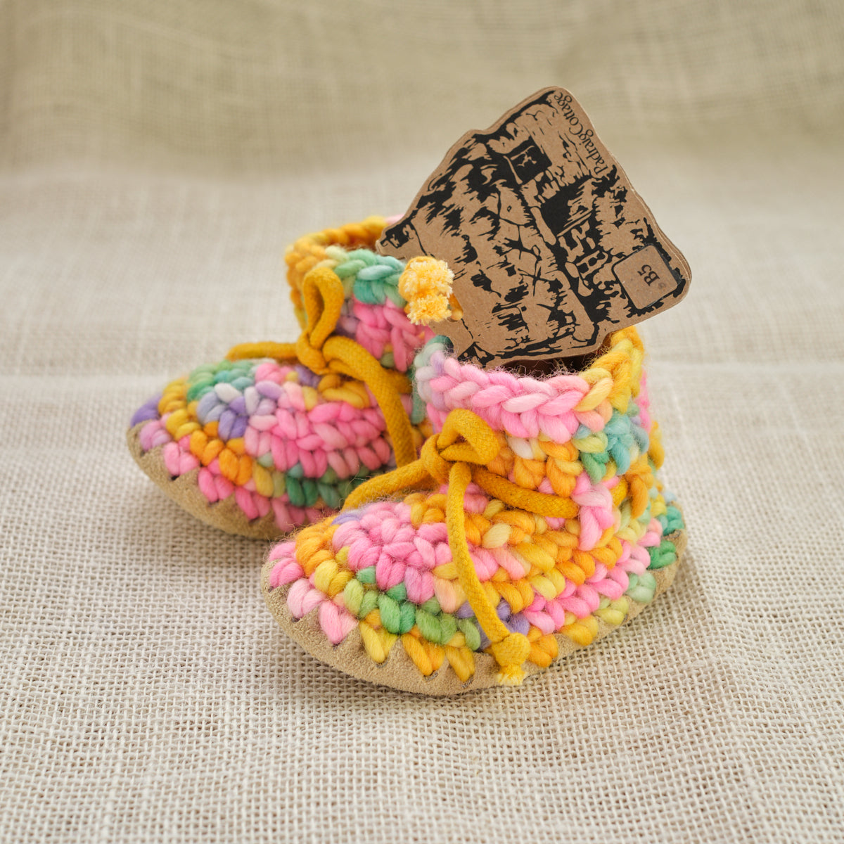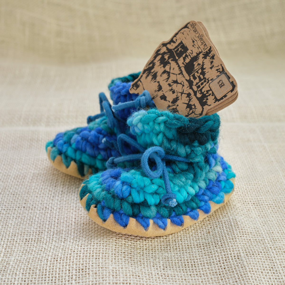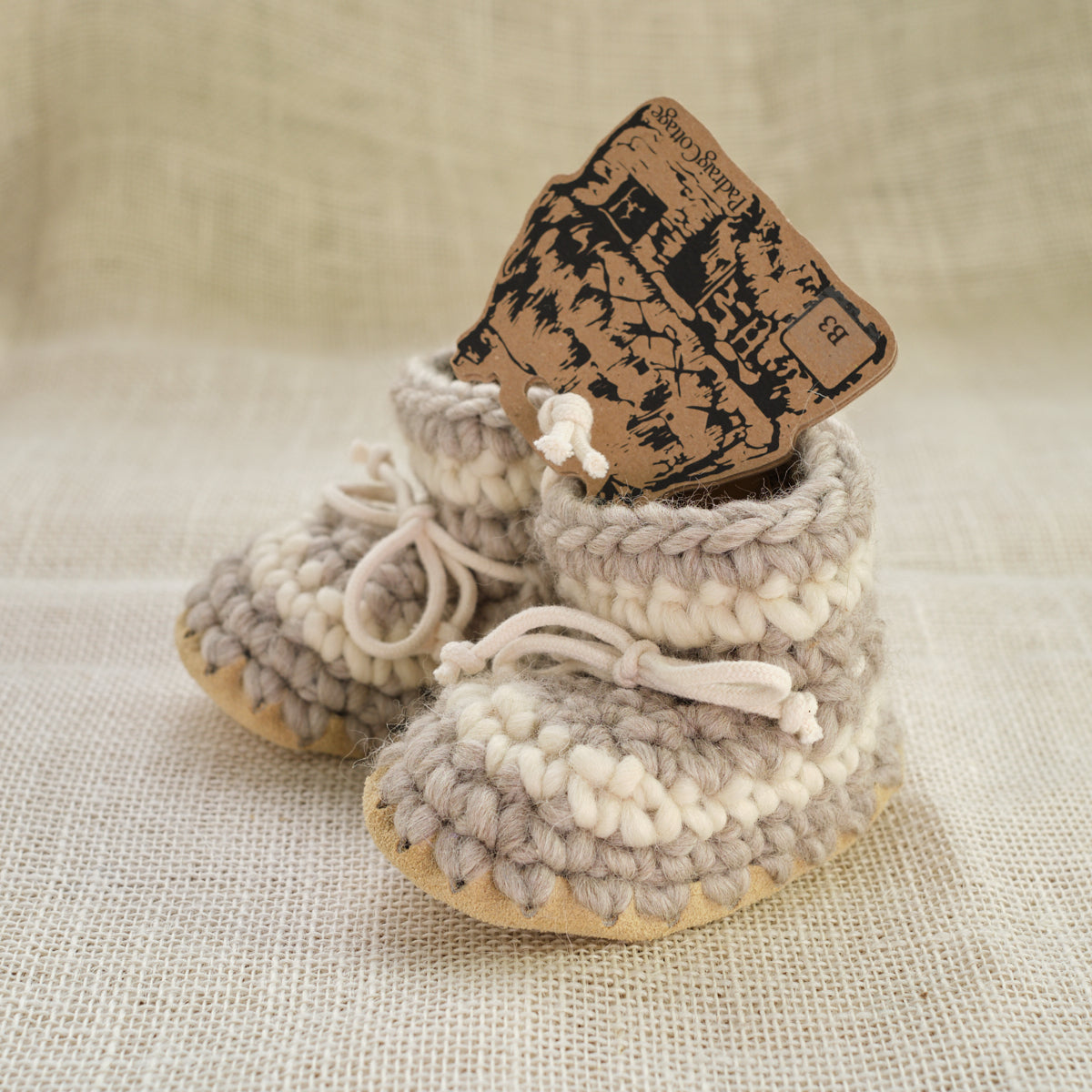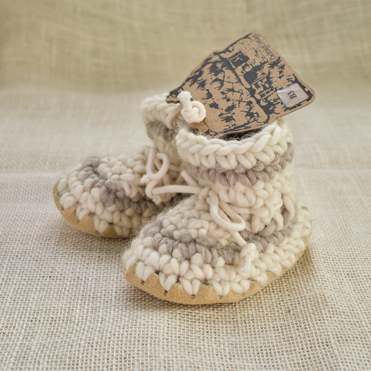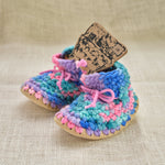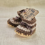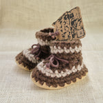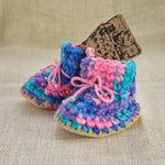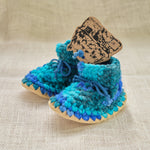 These wool slippers are amazing. Many are used as first walking shoes and can be worn outside in nicer conditions. New Zealand Wool roving crocheted with wool fleece lining and leather soles. They shape and conform to the foot and stretch just a little with use so having a snug fit is desirable. Made in Canada by Padraig Cottage.