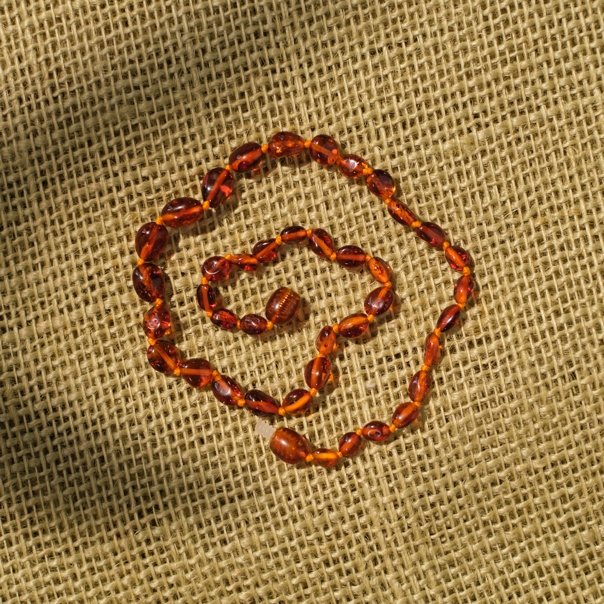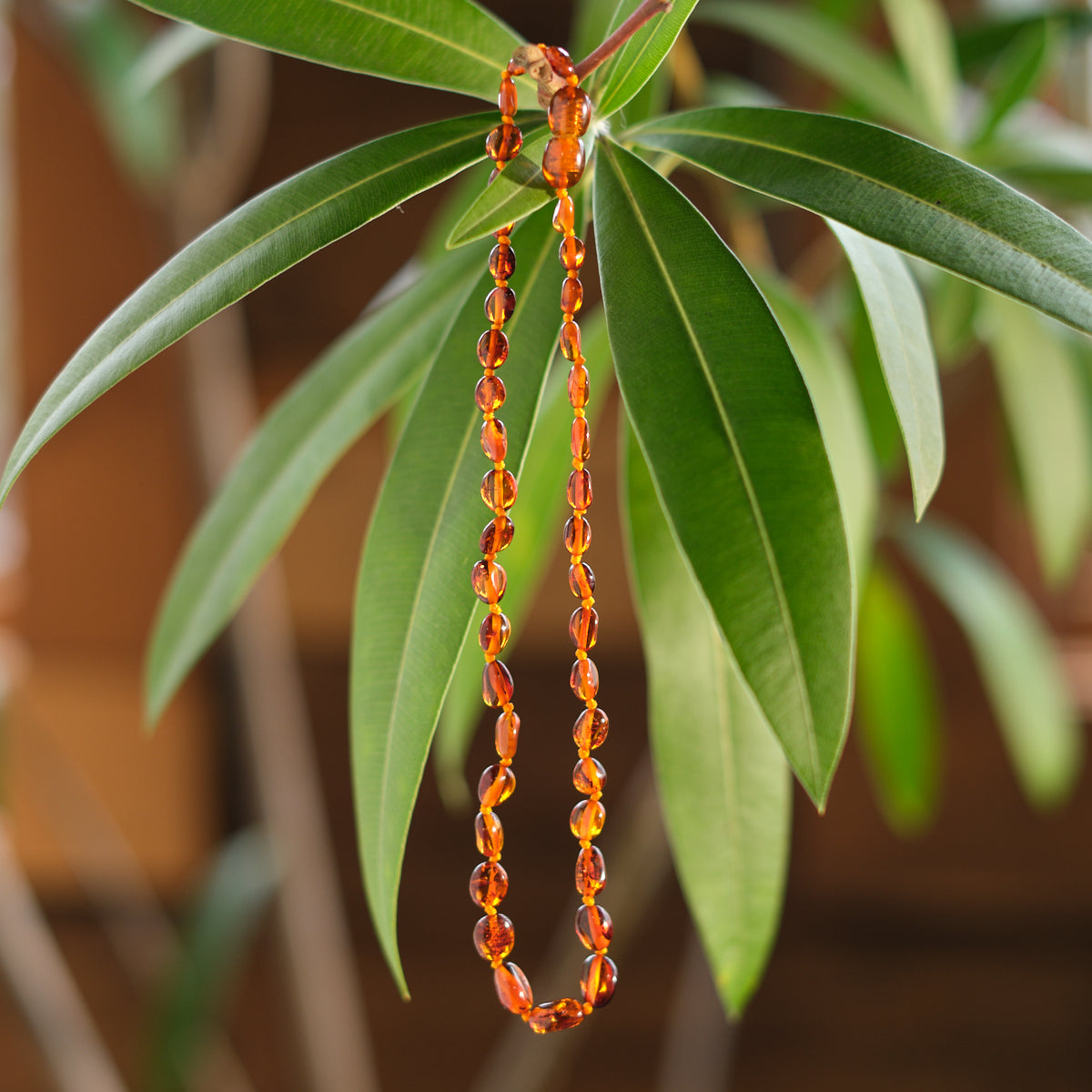Cute mini oval bead style necklace is 12-13" long with an amber bead screw clasp. Succinic acid, the active ingredient in Baltic Amber may help reduce teething symptoms when worn next to the skin. Do not place in mouth nor chew upon the beads. Select the amber bead color you like best!