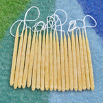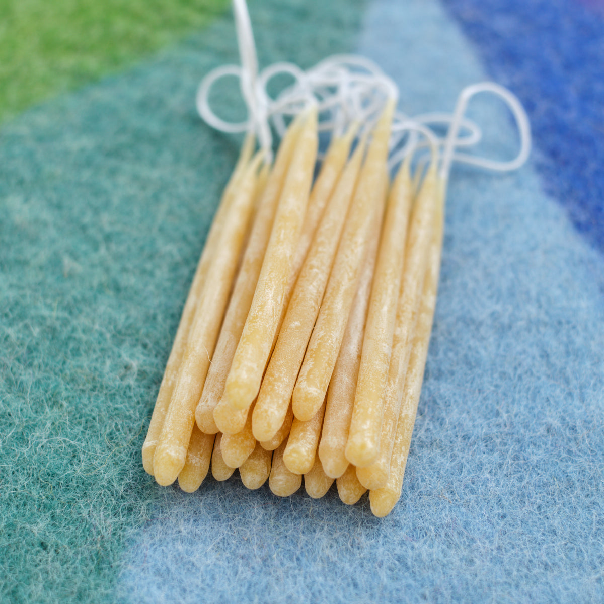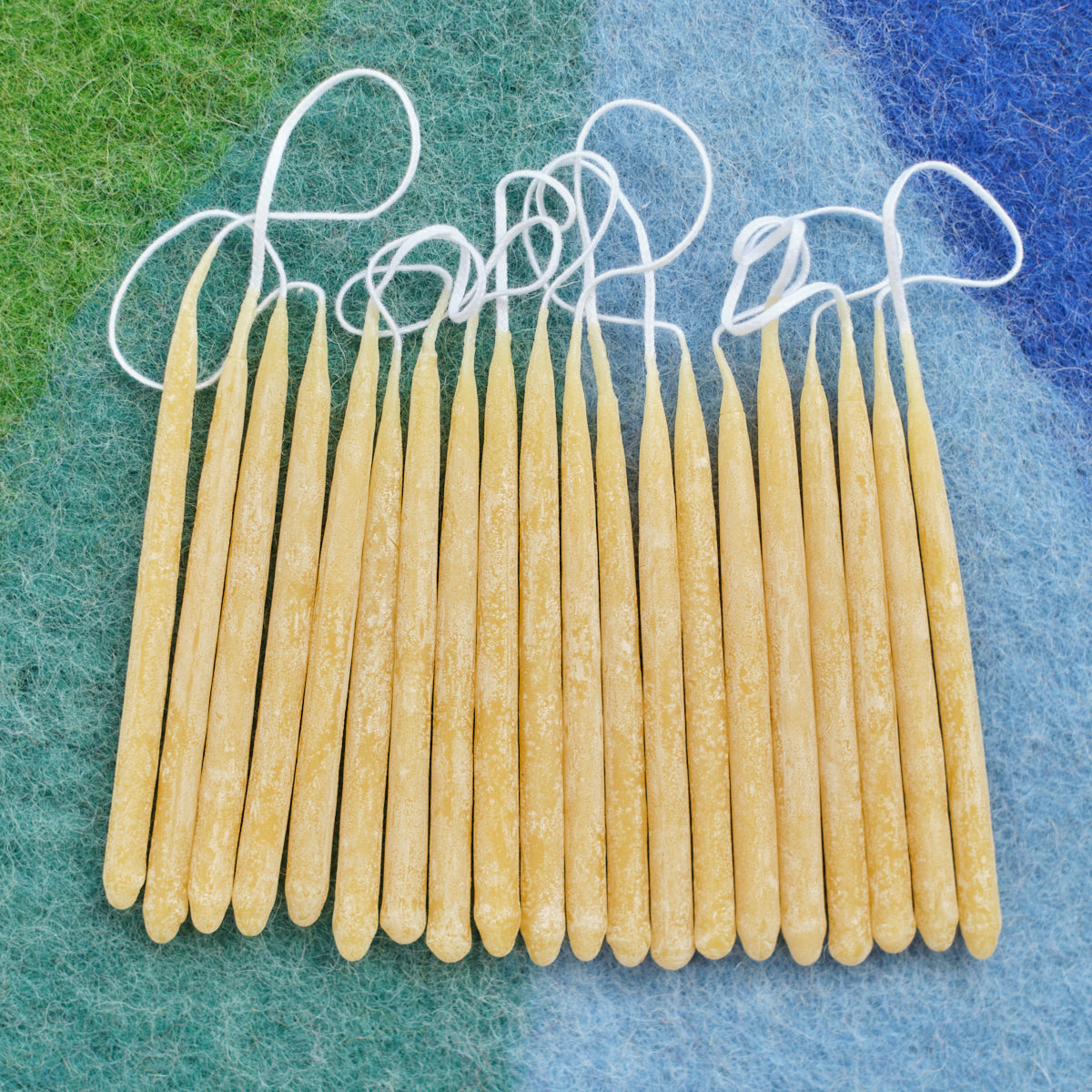 Our hand dipped natural beeswax birthday candles add a festive air to any celebration! Burning beeswax candles give a wonderful warm glow and fills your home with a wonderful aroma. One set of 20, cotton wick beeswax birthday candles.