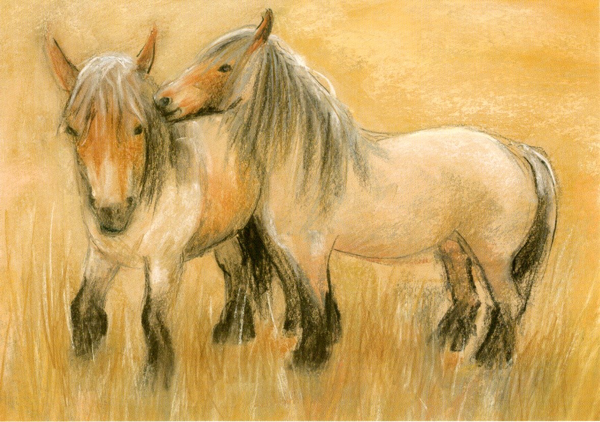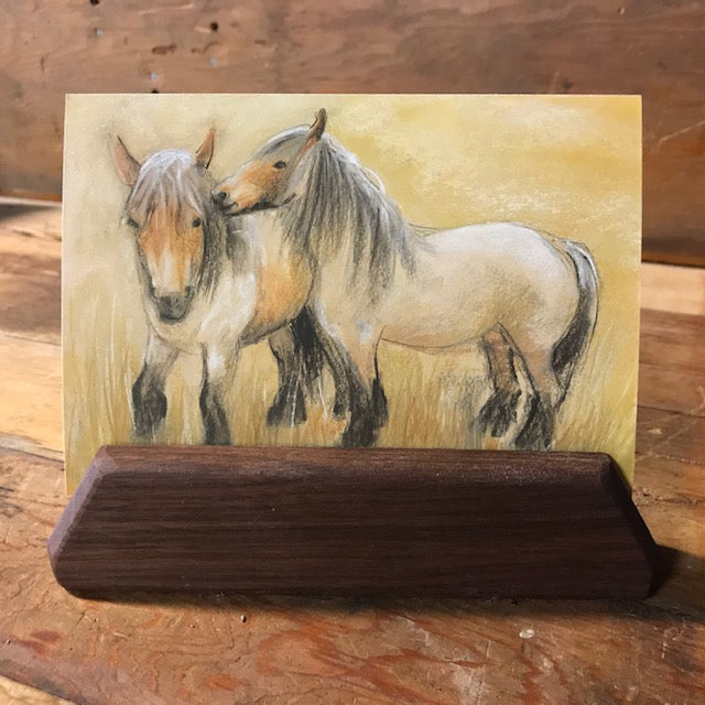 Beautiful scene of Belgian horses by the Dutch artist Marjan van Zeyl. Due to metric conversion the postcard size is just under 4.25" x 6". Second picture show in our walnut wood postcard holder.