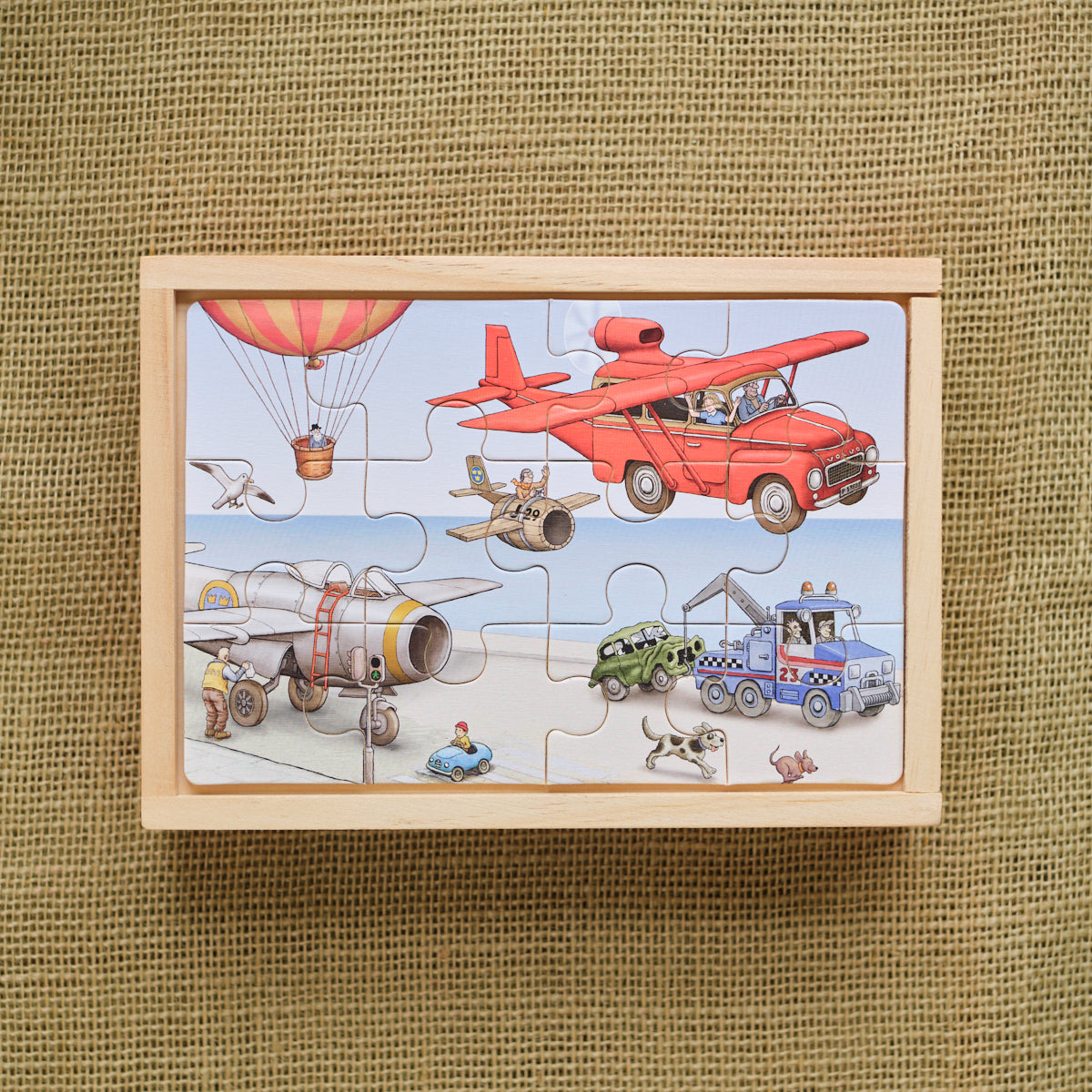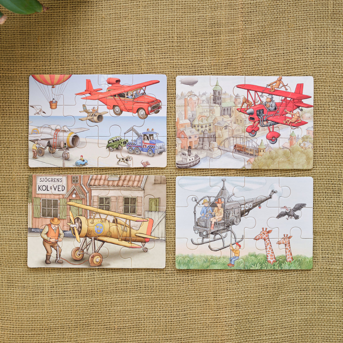 Four different puzzles in one box! Create memories around the house on rainy days with this Biplanes Box Puzzle Set. Includes 12 pieces per puzzle, 48 pieces total.