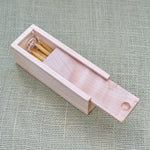 Our Solid Maple Boxed Birthday Candle set is perfect for keeping your celebration or nature table candles stowed away safe. Sliding box container is sized good for similar sized candles, small modeling beeswax pieces, and other small objects.