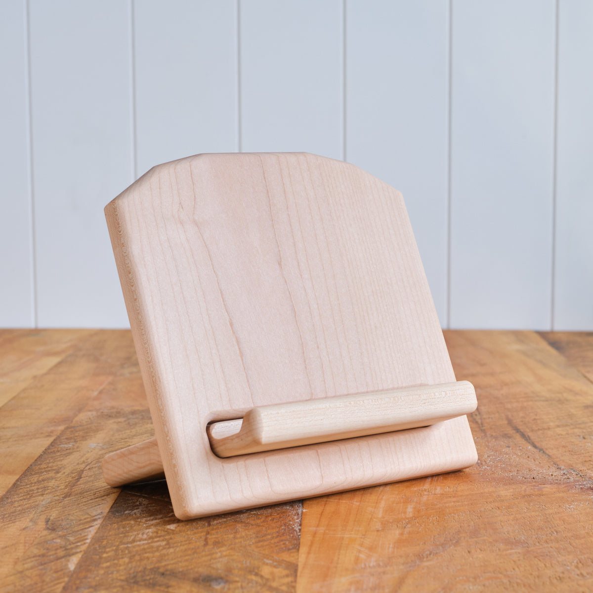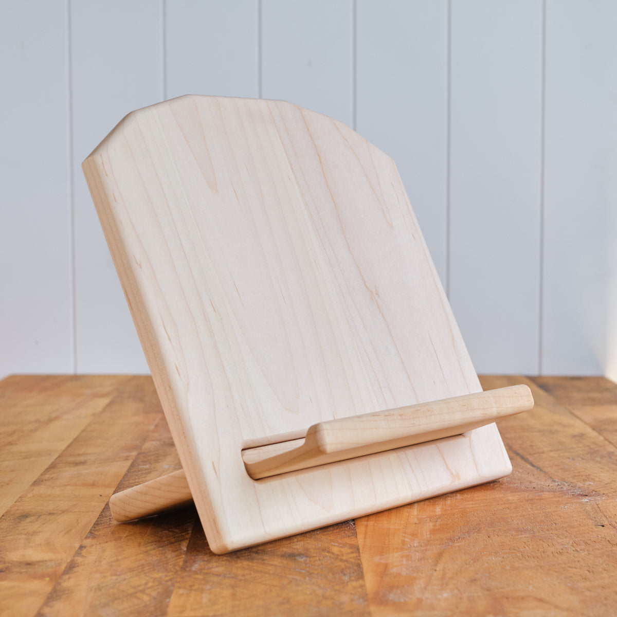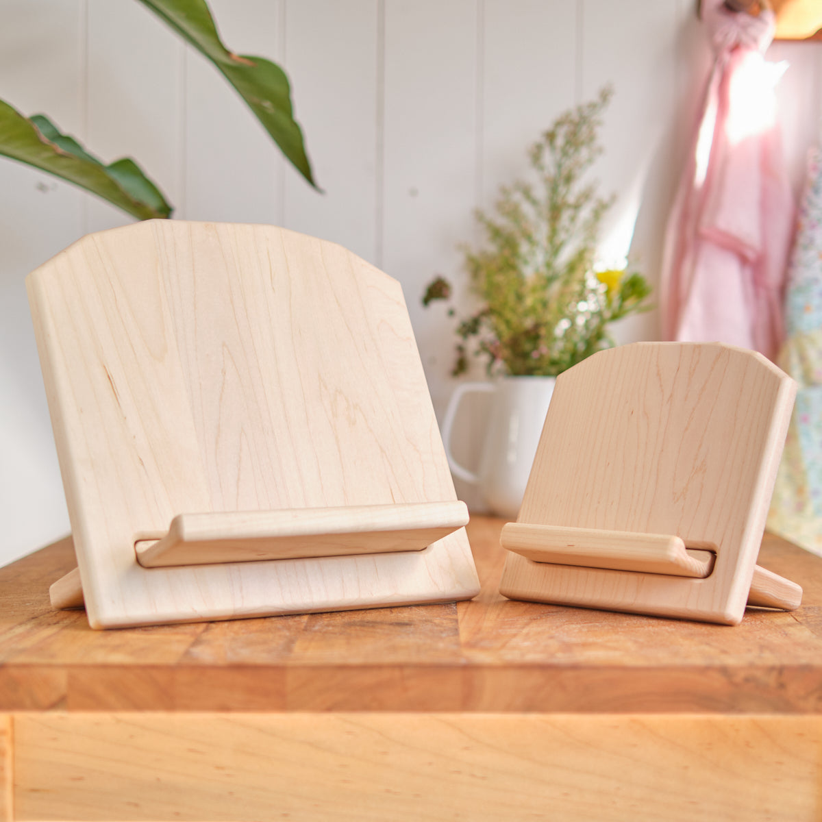 This table top stand can display art work, books or anything else that you want to display or have easy access to. Made from solid maple wood, it is sturdy and beautiful. Featuring our Camden Rose signature design of sculpted top and round over edges so it is soft to the touch and visually appealing. Book ledge has a scooped area to help keep the pages from your book from flipping. A clip may be needed to hold pages too. Sturdy enough to hold very large books. So many uses. Available in mini or large sizes.