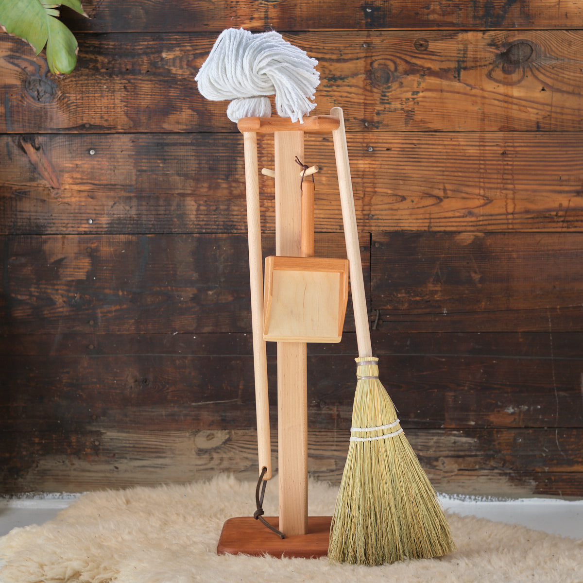 Holds up to 4 of our mops and/or brooms. Also features 2 pegs for hanging a dust pan and whisk broom! What a great way for your little one to keep their cleaning supplies organized. Simple assembly of screwing on the base - tools/hardware included.