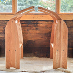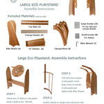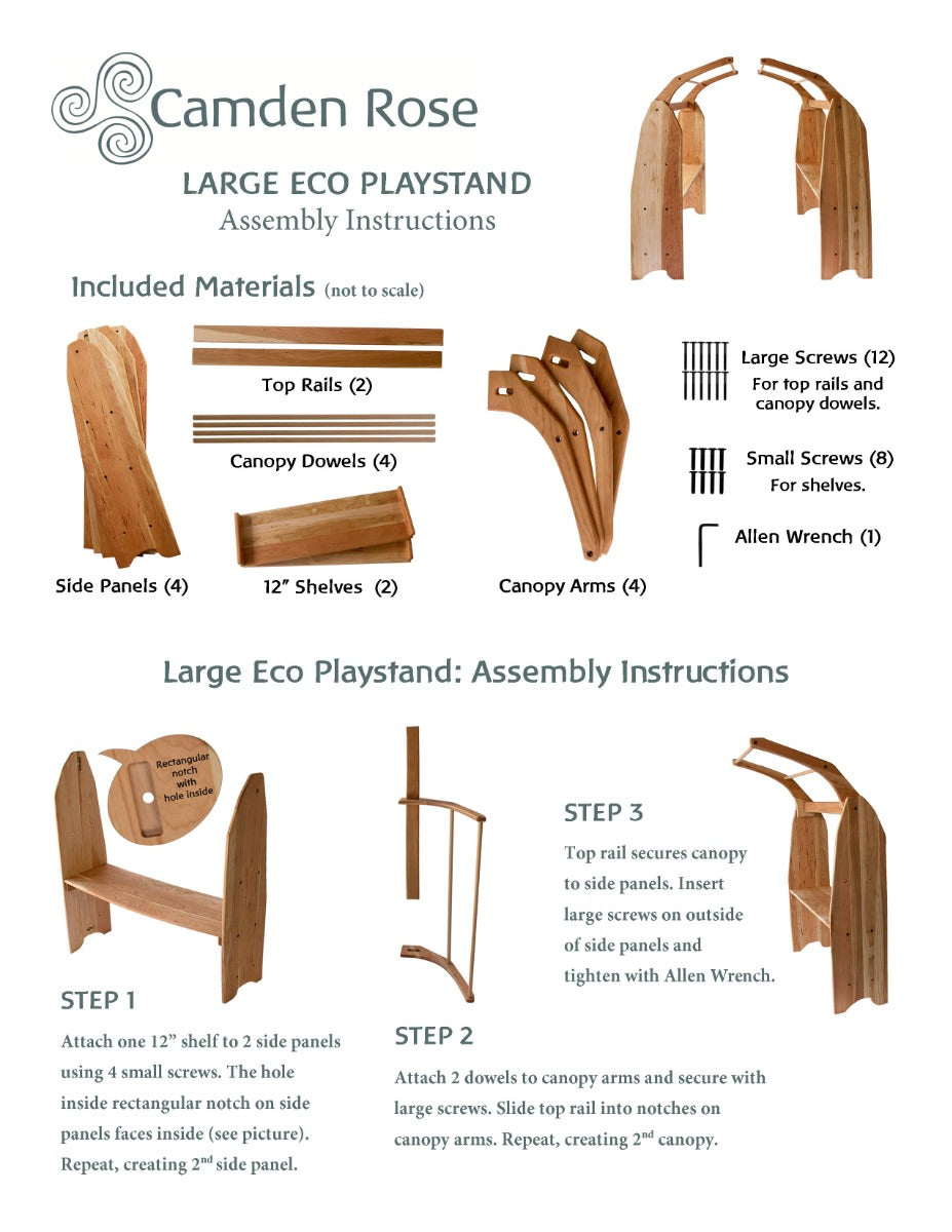 The Eco Playstand has two sides joined together with wooden canopy arches. Includes four side panels, two 12" wide shelves (one for each playstand side), top rails, and four canopy arms with dowels. All parts required for assembly are included.