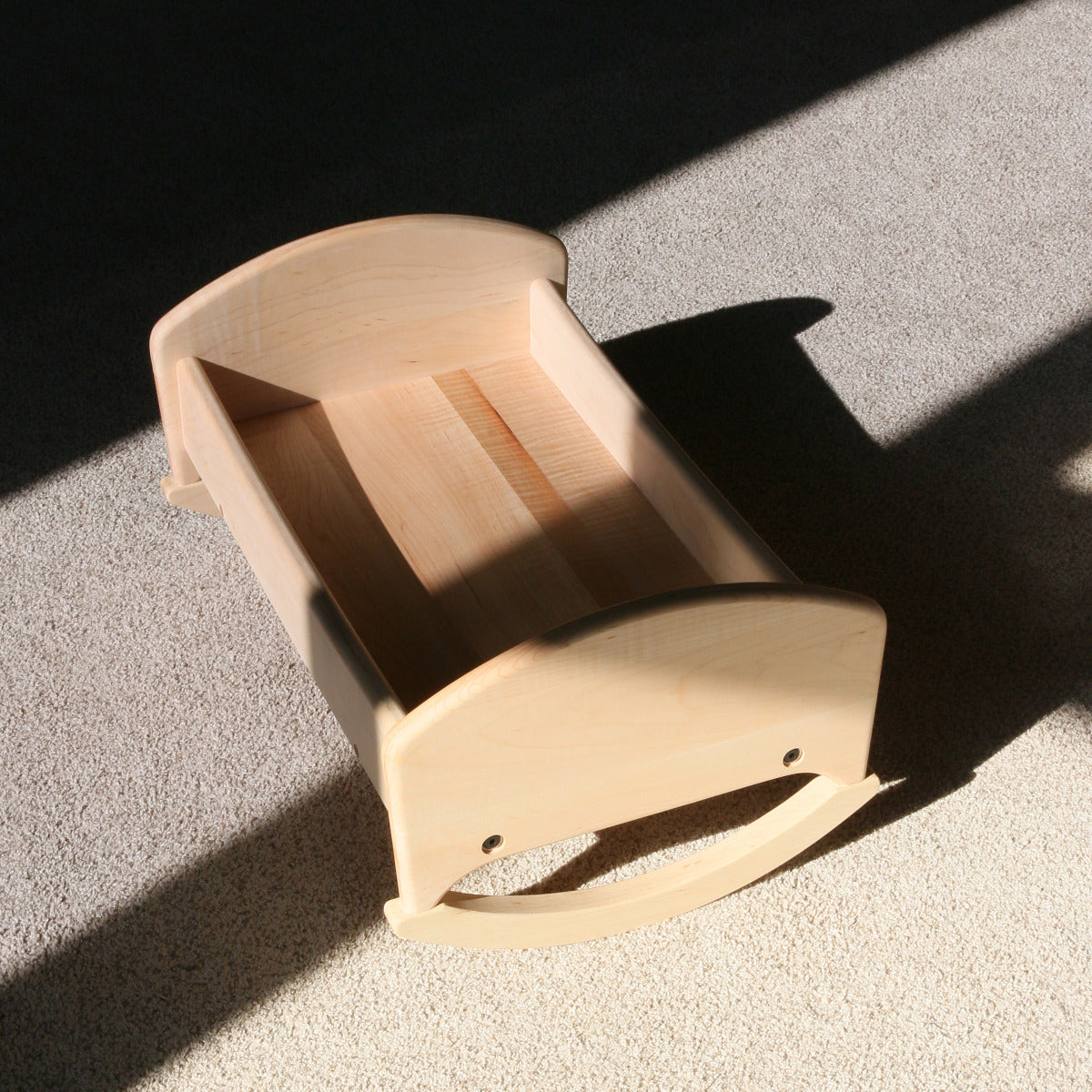 The Cherry Doll Cradle was designed with gentle curves, the Cherry Doll Cradle will endure the toughest play. Fits dolls up to 18" tall including most baby dolls, Camden, Waldorf and American Girl dolls. Simple assembly of the headboard and foot board required. Add some doll bedding (sold separately) to keep your doll warm and cozy while sleeping! Made in the USA by Camden Rose.