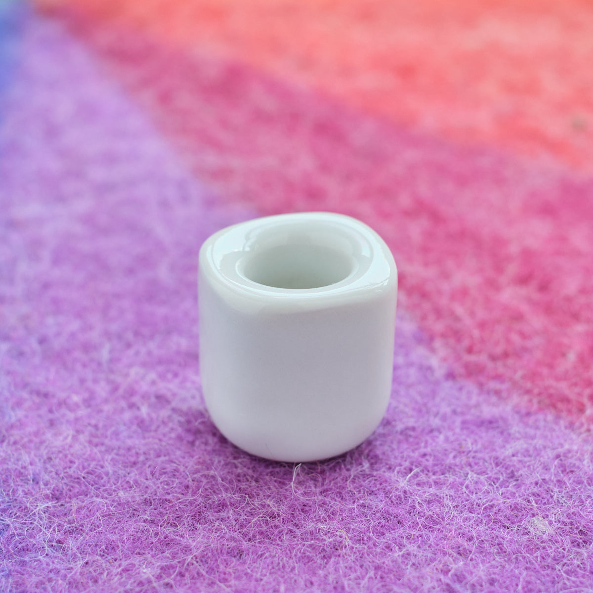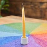This Ceramic Candle Cup is just the little light you need! Perfect for a nature table or celebrations. It does fit our 5" tall beeswax taper candles, 1/2" diameter. The candle will fit a little loose but when it melts it will snuggle into the candle cup with the melted wax.