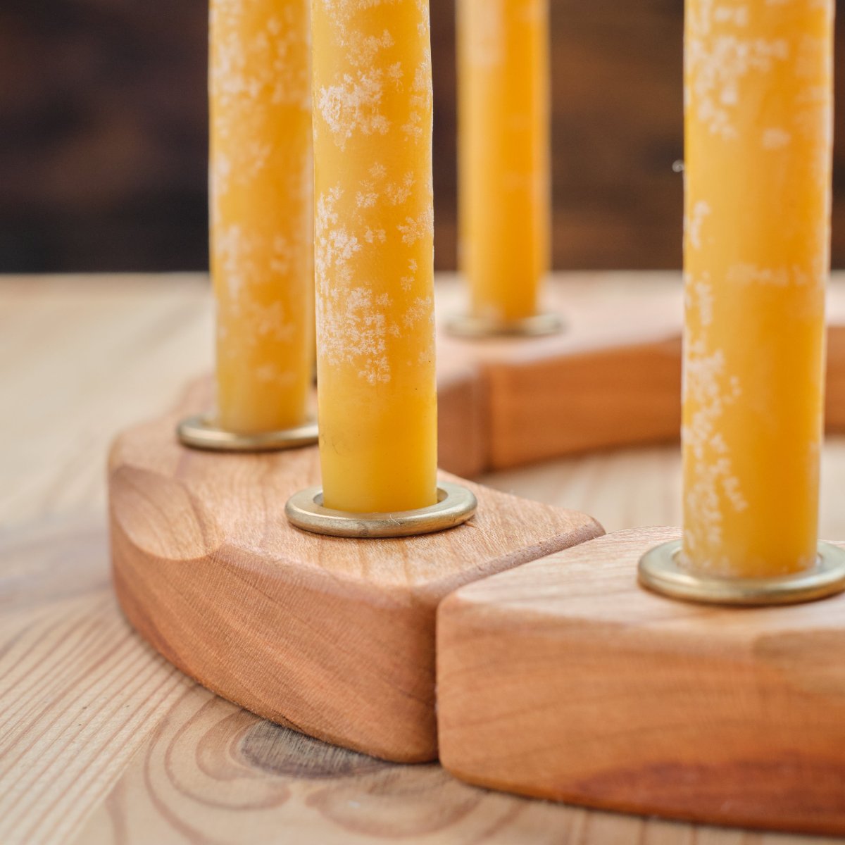 - Set Includes: 4 cherry semi circles with 3 holes each; 12 brass removable candle cups; 12 hand-dipped candles 5" long x 1/2" in diameter.