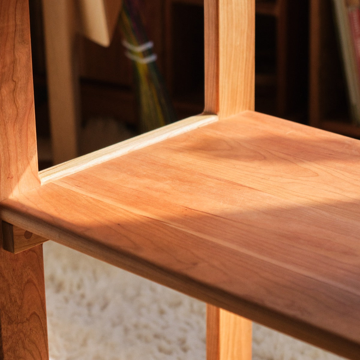 Solid Cherry Wood, no mdf, plywood or particle board. Cherry wood is a beautiful, living wood that darkens with light exposure, transforming into a rich reddish brown over time. We finish it with our All Natural Beeswax Polish (organic jojoba oil and local beeswax). Since this is a light finish, you will need to re-apply when it looks dry, at least annually.