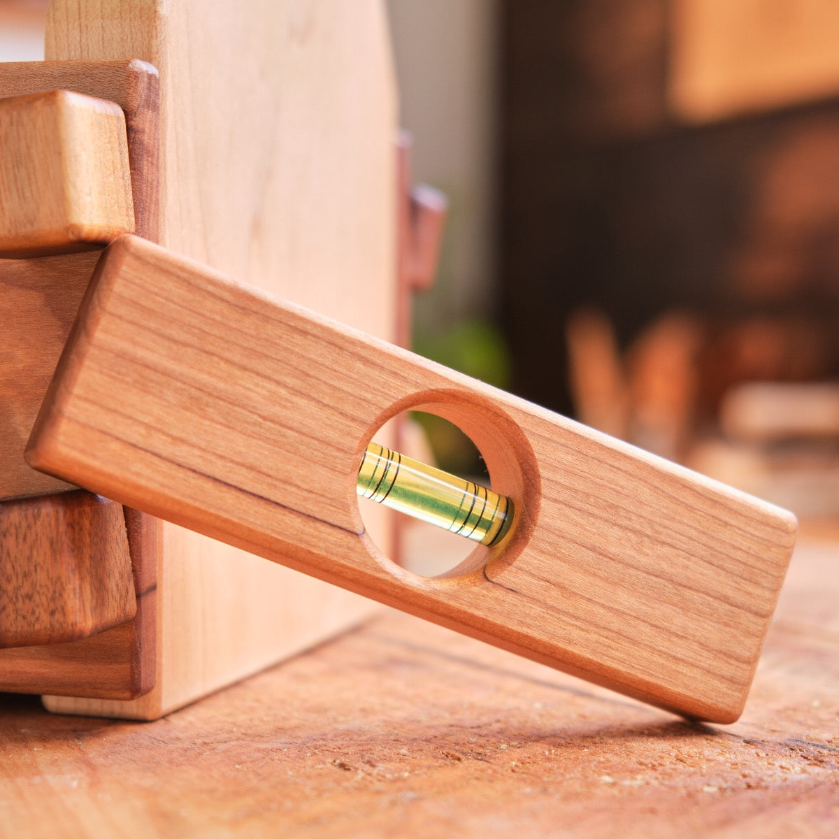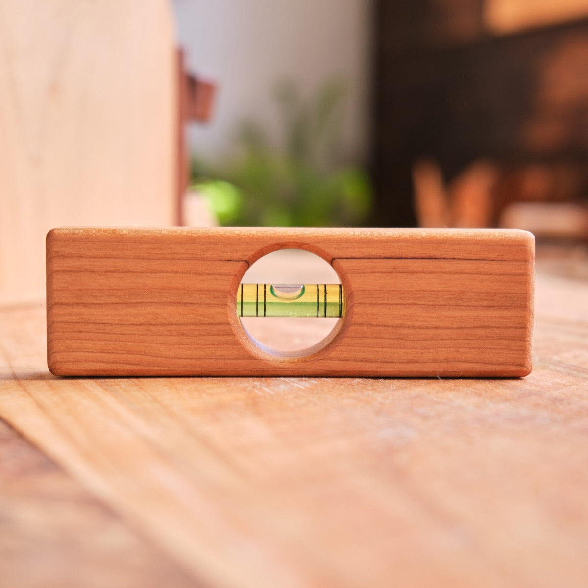 This cute addition will occupy pretend play with understanding what may be level. Since it is a toy, it is about 90% accurate (okay, we did the best we can do to make them). Cherry wood outside with plastic level insert inside (made in China) is great for a little older budding carpenter.