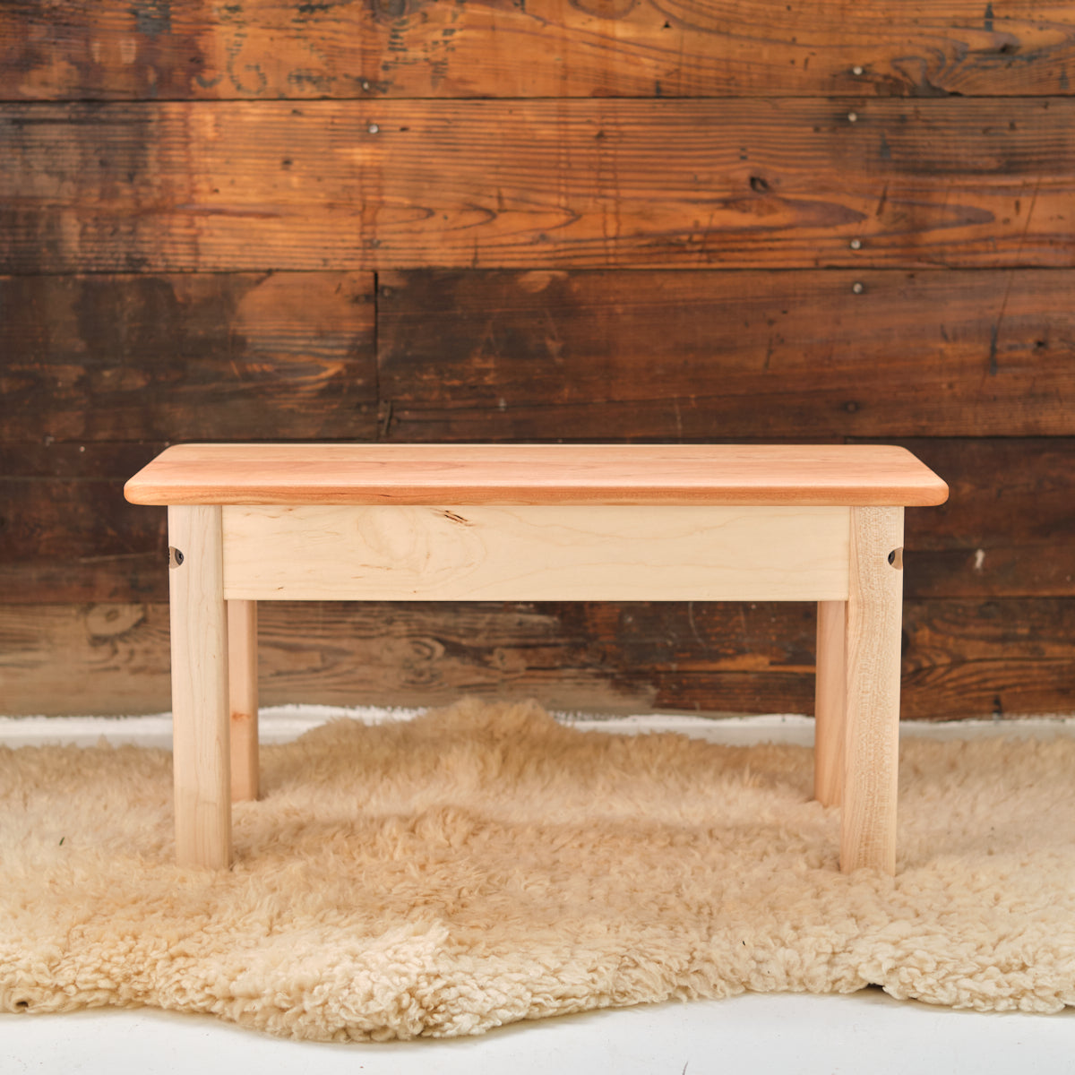 Our Cherry Simple Bench will seat two toddlers comfortably. Made of beautiful cherry and maple hardwoods. Bench seat is cherry wood, and the bench "skirt" and legs are maple.