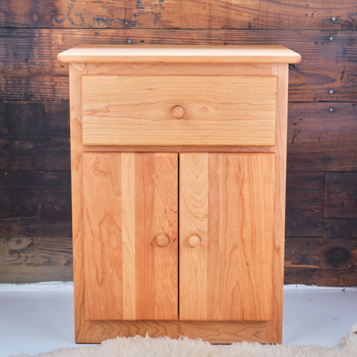This gorgeous Cherry Wood Night Stand with bolt knobs will surely complement your bedroom or playroom nicely. With one drawer on top and two doors below with a middle shelf, this gives you plenty of storage space for anything from books and journals, to slippers and clothing. Features dovetail drawer sides for strength and a plywood bottom on drawer only. Great addition to any playroom or bedroom.
