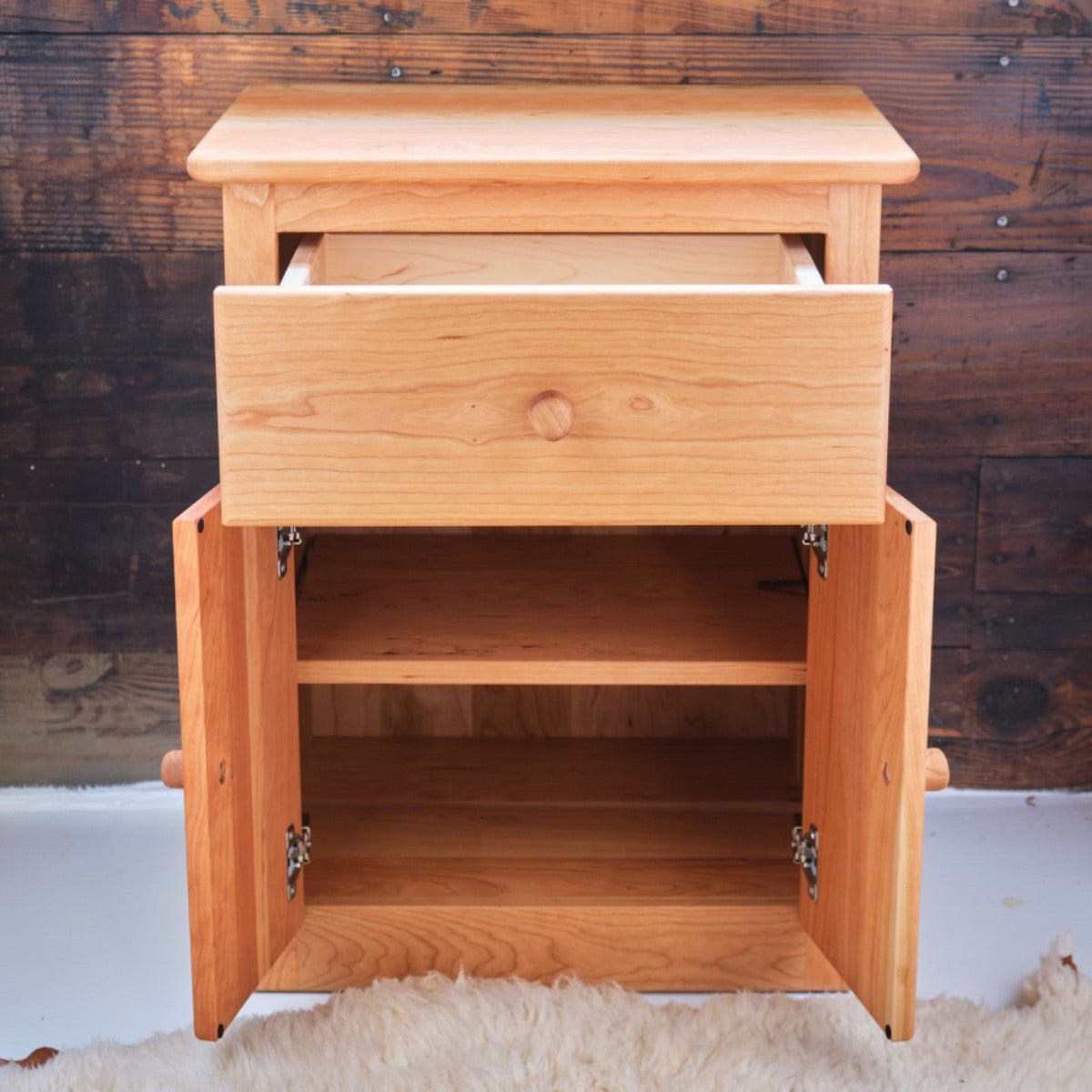 - Materials: Cherry Hardwood, plywood (bottom of drawer), and metal hinges and drawer glides