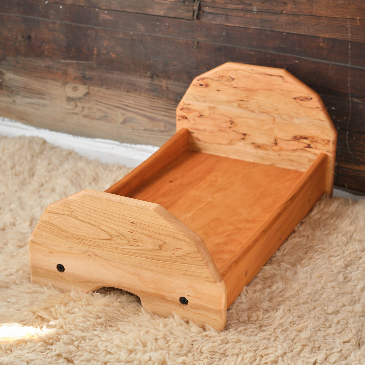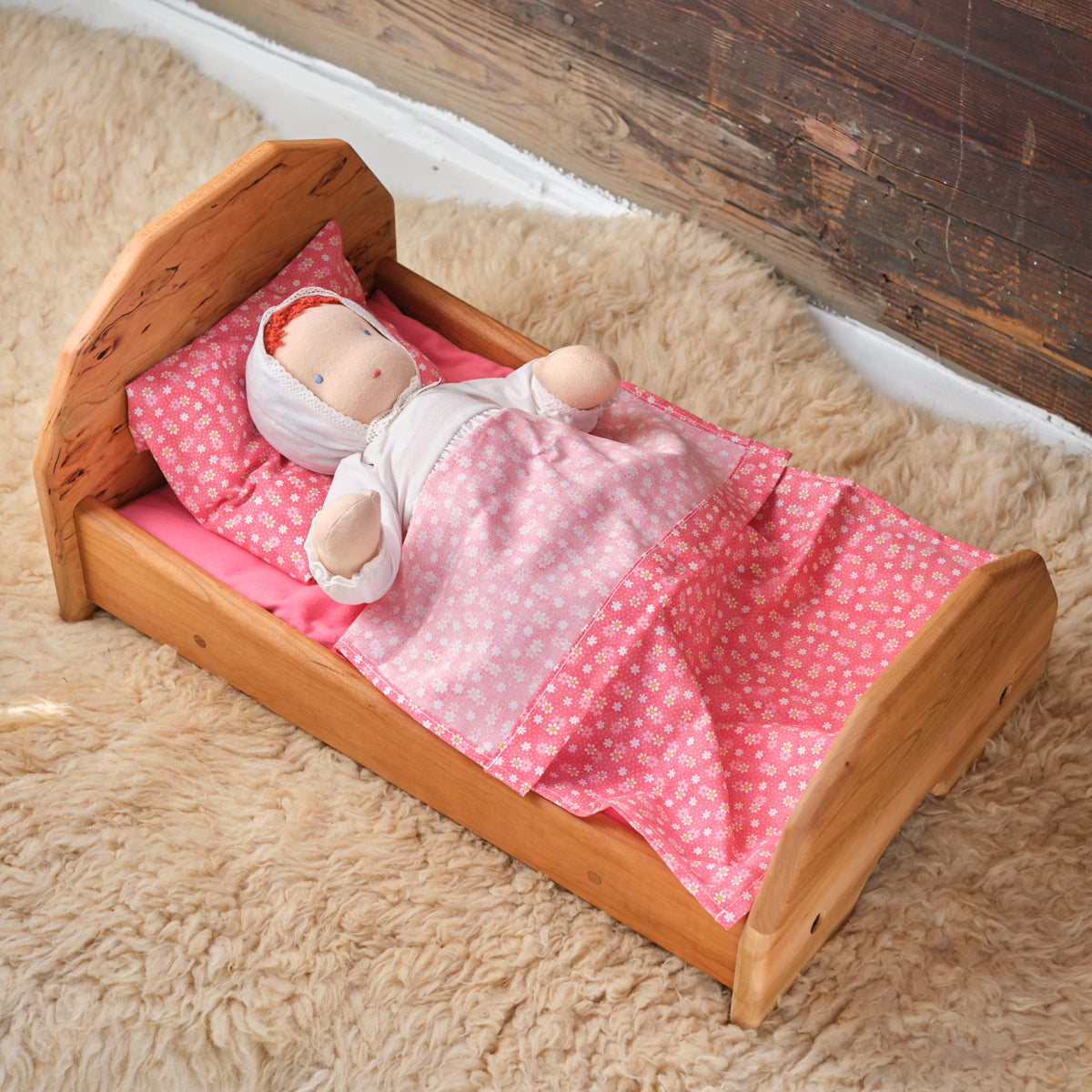 Designed with gentle curves, our Cherry Wood Doll Bed is sturdily made. Fits dolls up to 18" tall including most baby dolls, Camden, Waldorf and American Girl dolls.