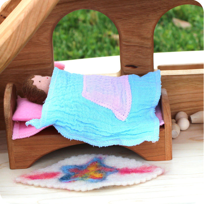 A simple, solid cherry dollhouse bed is just the right size for our Waldorf Dollhouse Dolls.
