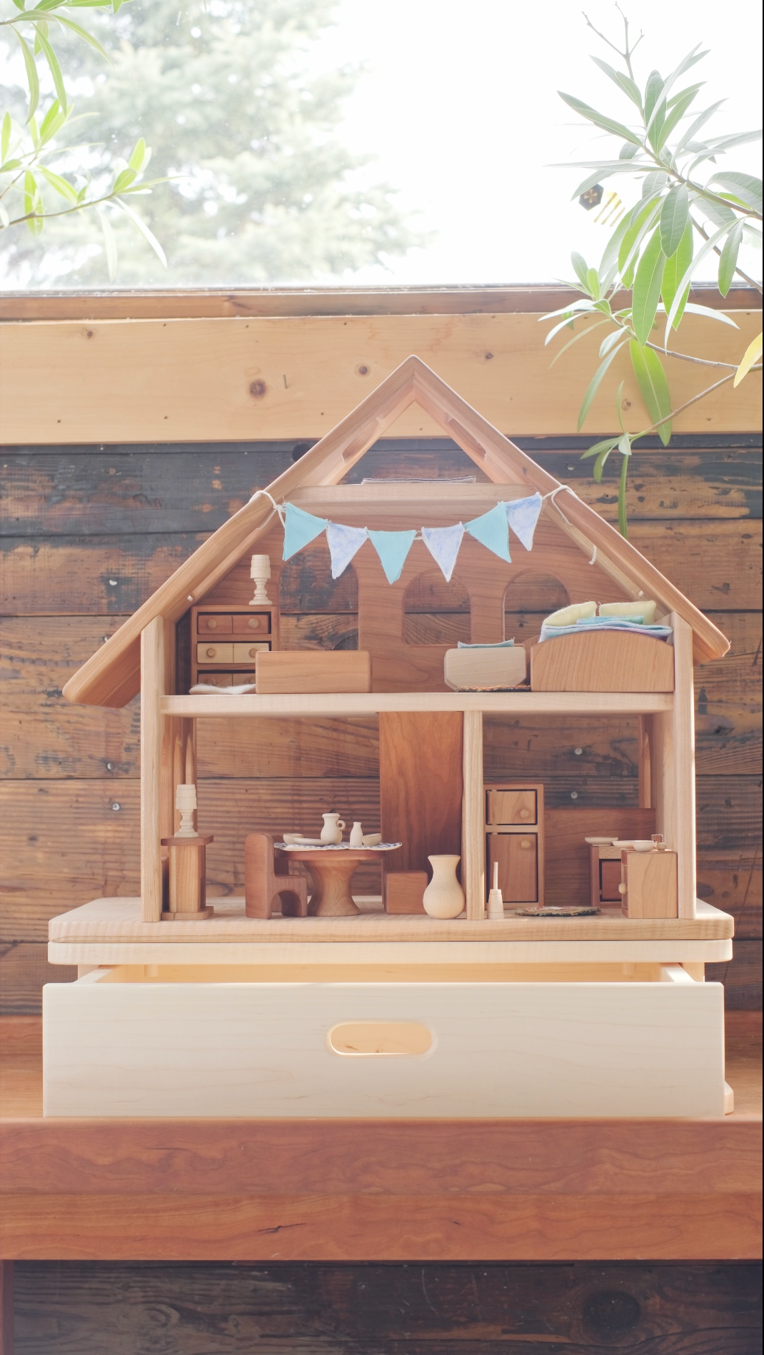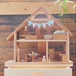 Our three story dollhouse features an open floor plan, and is open front and back to encourage interactive play. Finished with Three BEEautiful Bees All Natural beeswax polish. Try placing Your Cherry Dollhouse on our Play Table or Dollhouse Riser for easier access and fun!