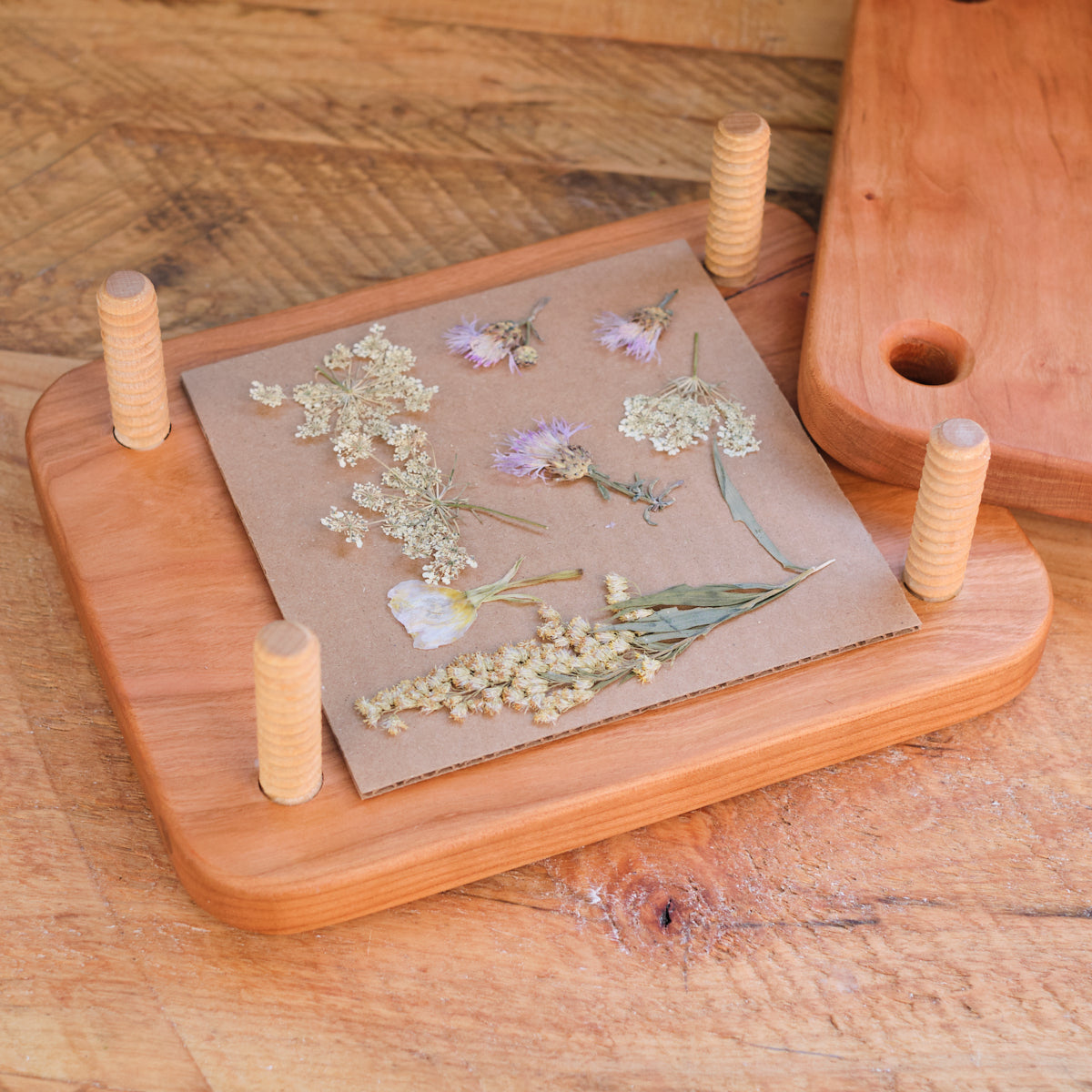 Our unique flower press will add beauty and uniqueness to any craft table. Just tighten the wooden nuts to press down between our super thick cherry wood that already adds weight. Powered manually.