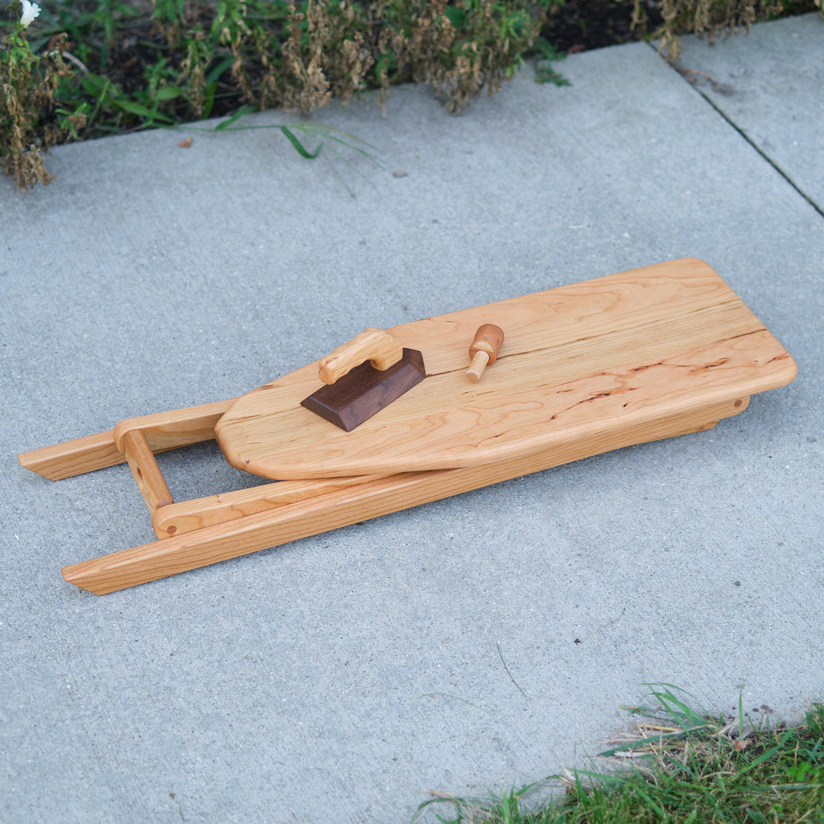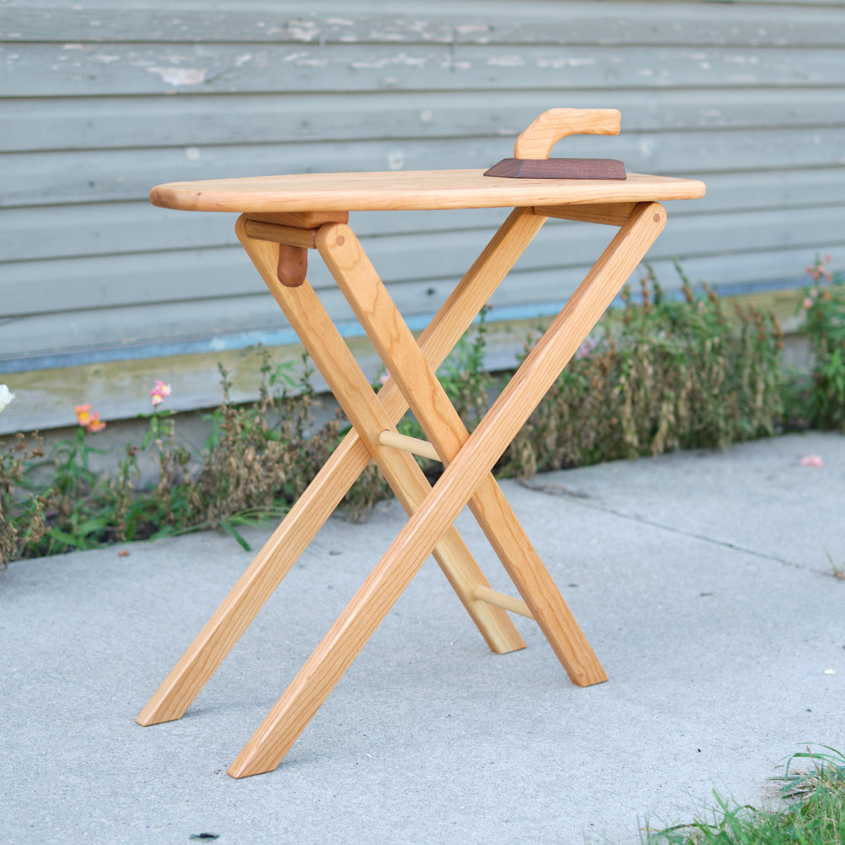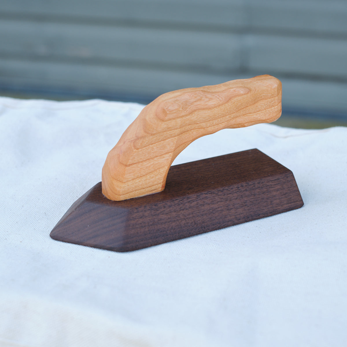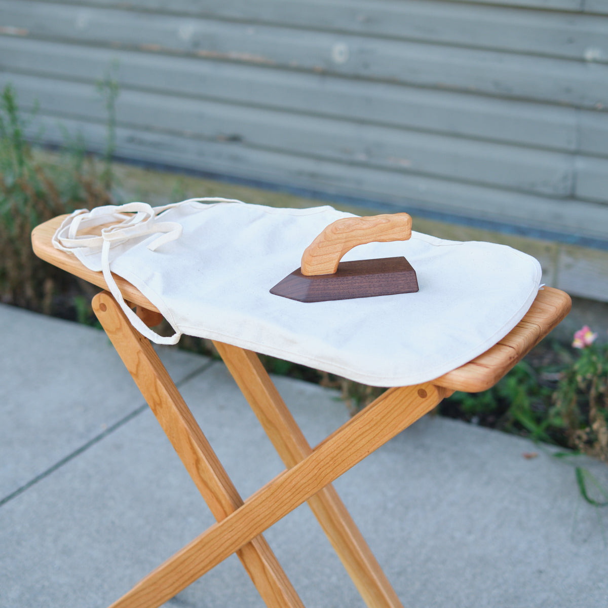 This beautifully crafted wooden toy ironing board collapses, unfolds, and locks just like the real thing. The matching Olden Days Iron features a dark walnut wood base with a beeswax finish, beautifully contrasted by an organically shaped maple handle.