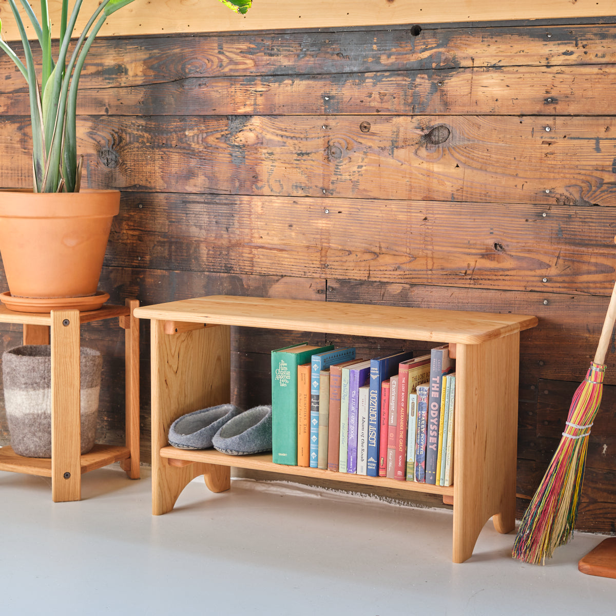 The shelf underneath makes great storage for shoes (dry shoes - our finish is not waterproof), toys, games, puzzles, baskets, etc.