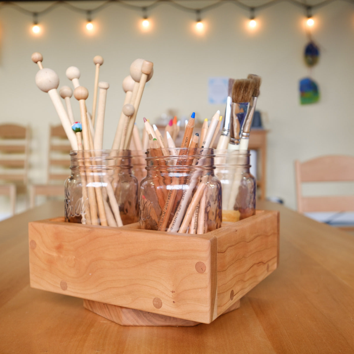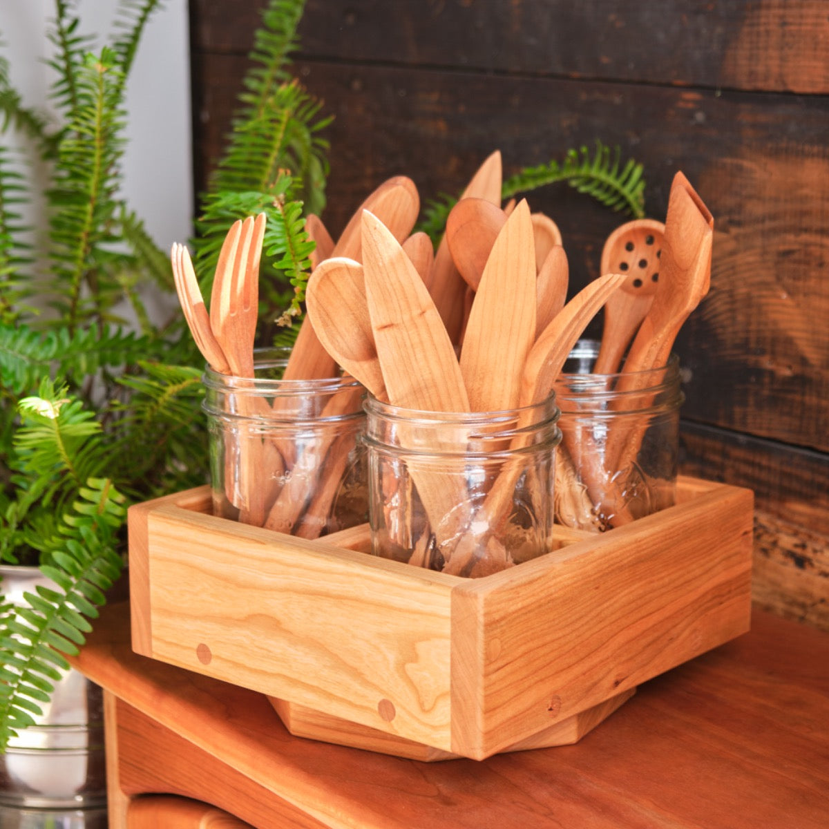 Store art/crafts/kitchen/food supplies or any other items. Sized to fit pint Ball/Mason jars with the dividers in or any other jars you desire. The dividers are removable or can be used individually. So many options. Beautiful cherry wood with our classic round over edges and sanding for a soft look and feel. Cherry wood darkens with sunlight to a rich deep red/brown color. Super sturdy and strong. Ball bearing lazy susan bottom for smooth spinning.