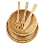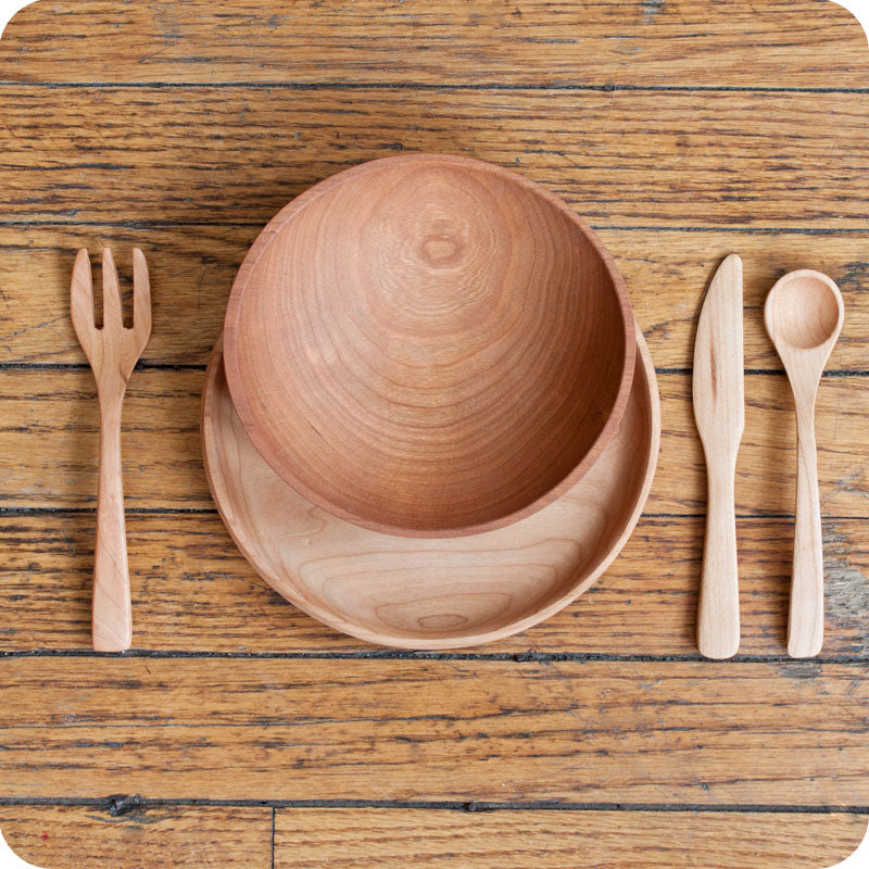 Crafted from quality cherry hardwoods, the Child's Wooden Place Setting includes a sculpted thin rim wooden bowl and plate with a 1/4" curved rim, and wooden flatware - fork, knife, and spoon. Each piece in our child-size wood place setting is ergonomically designed for small hands and mouths.