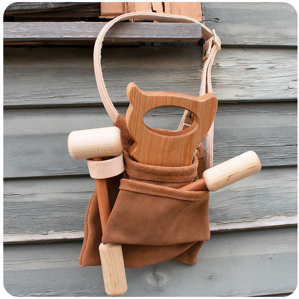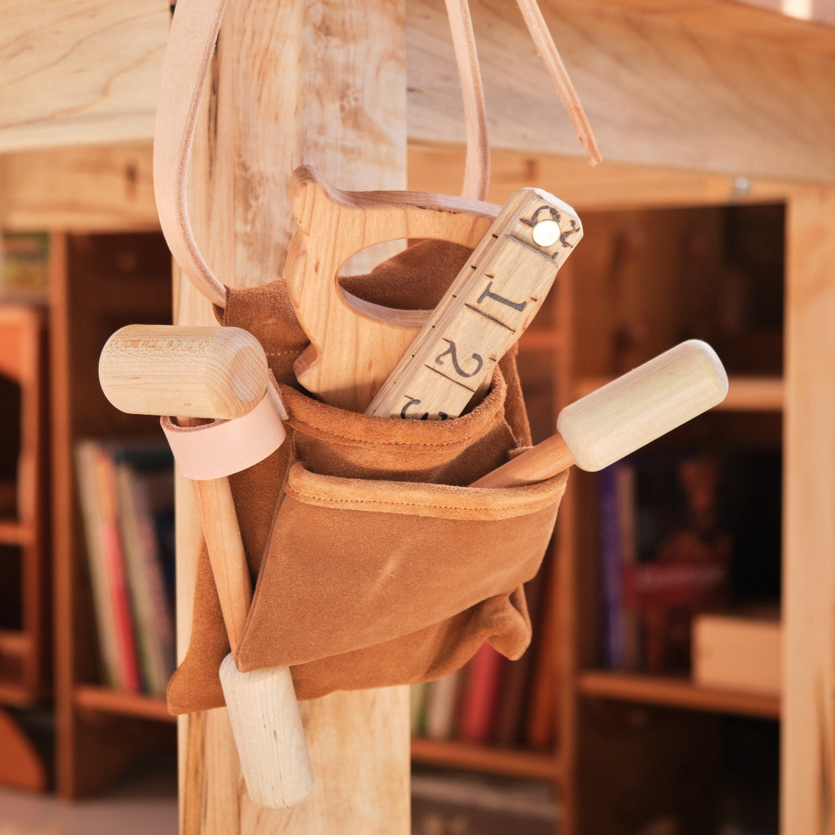 This handy set comes with a hammer, screwdriver, saw, folding ruler and suede tool belt. This durable natural suede pouch features a leather hammer loop and belt. Proudly made in the USA. Tools are made from cherry, maple and birch wood. The ruler is made from poplar.