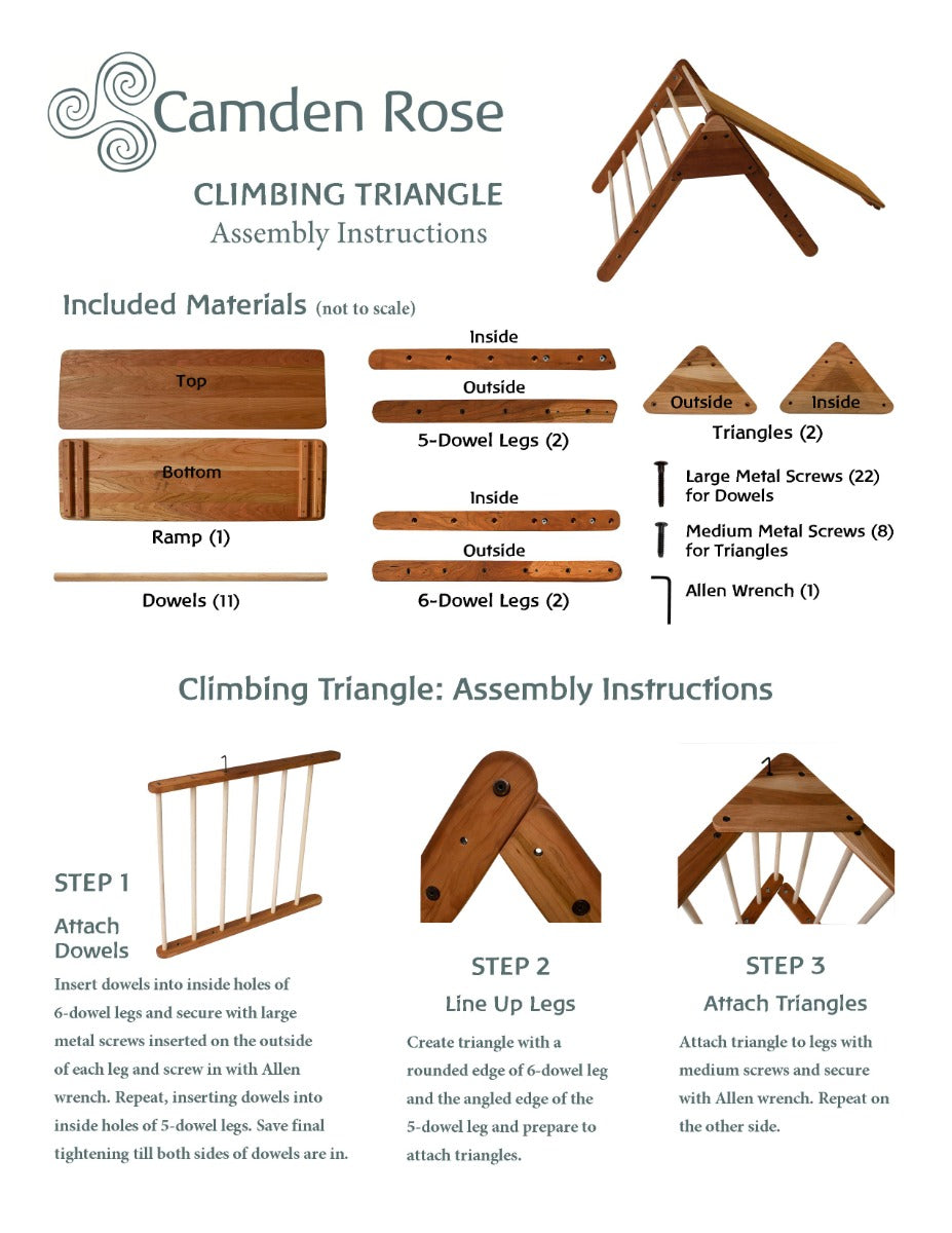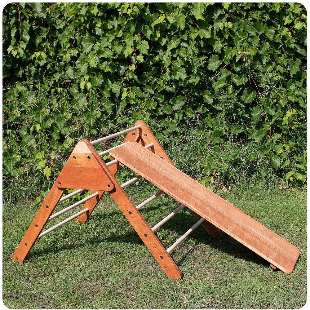 Our Climbing Triangle Set was created after many of our customers wanted this made with our beautiful cherry wood to match our other furniture. Cherry wood is a beautiful, living wood that darkens with light exposure, transforming into a rich reddish brown over time.