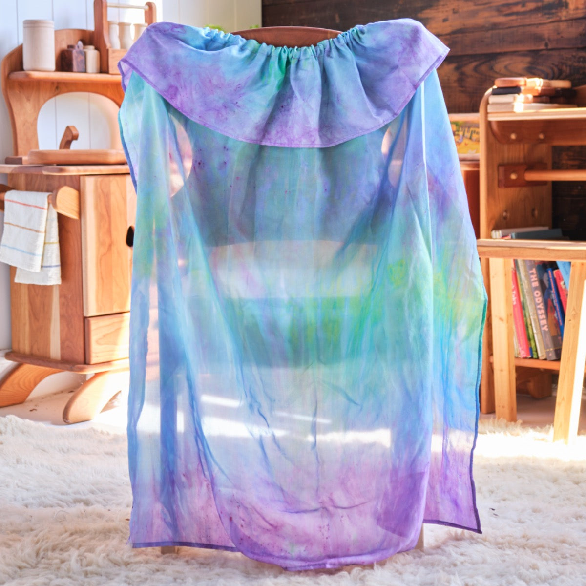 Light and airy, silk feels wonderful on the skin! Once your child ties on our Silk Cape they become whatever they imagine. More than a cape, it may also become a headdress, apron, skirt, veil, a curtain, and more. Natural variations in the fabric dyeing process makes each one unique. Choose from multiple color options.